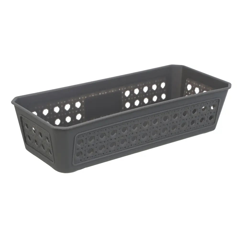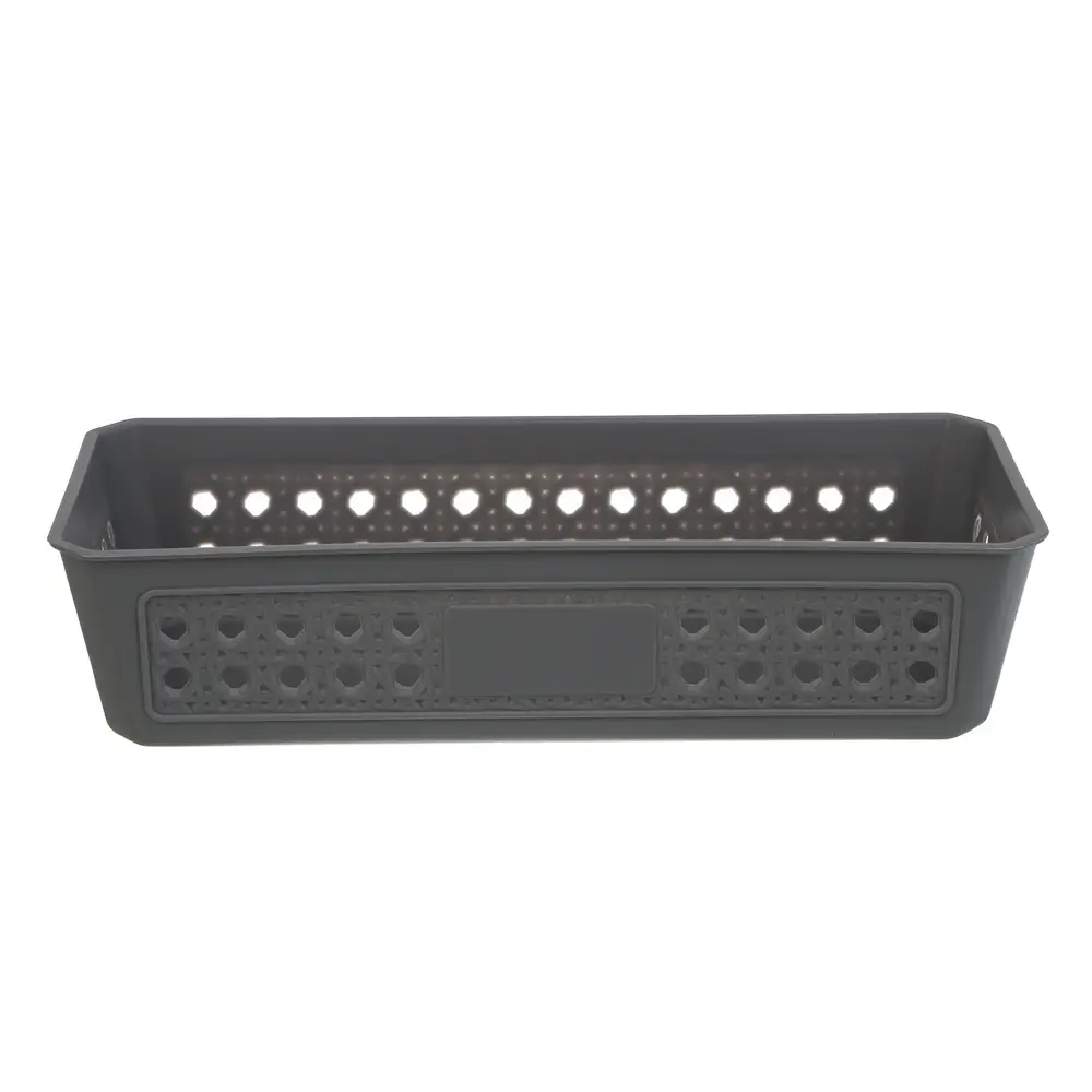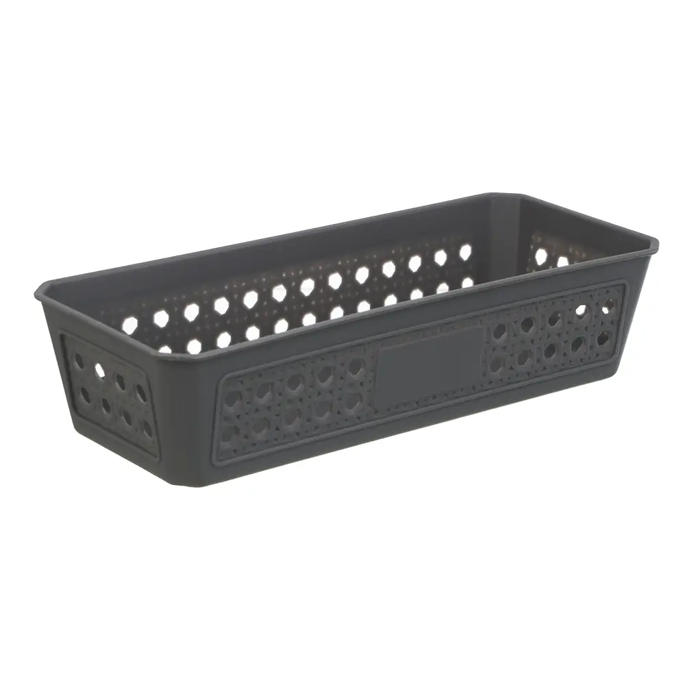 Стильная корзина VETTA – практичное решение для организации пространства в любом помещении! Благодаря компактным размерам 26,5х11,4х6,5 см она идеально подходит для хранения различных мелочей, не занимая много места. Современный дизайн в сером цвете гармонично впишется в любой интерьер, а перфорированные отверстия обеспечат отличную вентиляцию содержимого. Пластиковый материал гарантирует долговечность и лёгкость в уходе. Прочная конструкция корзины позволяет надёжно удерживать вещи, а специальная форма обеспечивает устойчивость при наполнении.