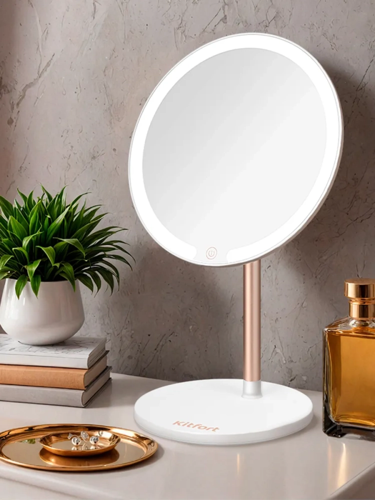 С косметическим зеркалом Kitfort KT-4127 нанесение макияжа и проведение косметических процедур станет удобнее. Зеркало устанавливается на подставку с магнитным держателем как на шарнир, благодаря этому вы можете поворачивать зеркало или регулировать угол наклона зеркальной поверхности.