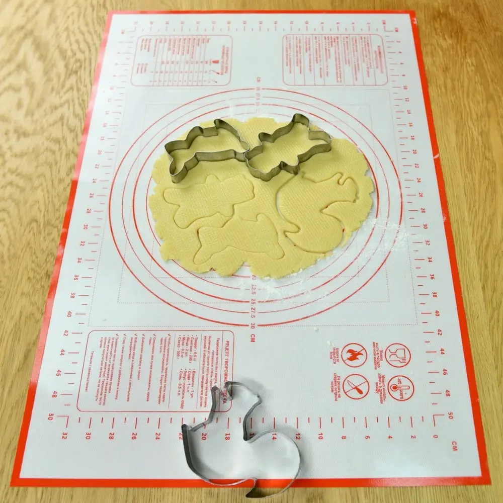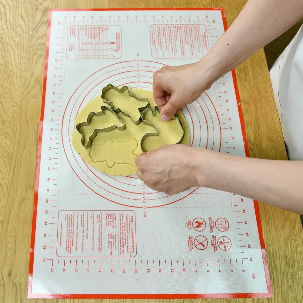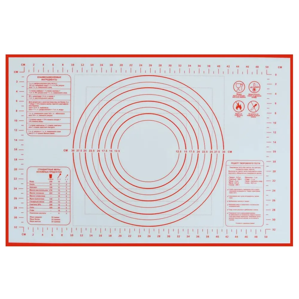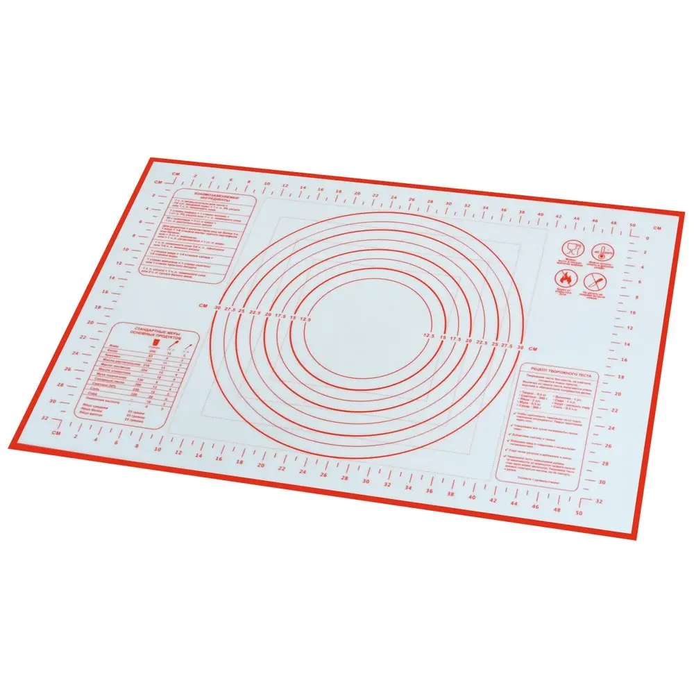 Предметы из силикона необходимы каждой хозяйке, т. к. они современны, многофункциональны, удобны в обращении, гигиеничны, не впитывают запахи, не выделяют вредных веществ и абсолютно безвредны для здоровья. Коврик из силикона обладает антипригарными свойствами его можно использовать для приготовления пищи в духовом шкафу на противнях или в микроволновой печи (выдерживает температуру от -30 C до +220 градусов С), а также при хранении продуктов в морозильной камере. Удобно использовать коврик для раскатывания теста, а благодаря имеющейся разметке, вы сможете раскатать тесто в идеальный круг или порезать его на равные части. Для нарезки используйте пластиковый нож или кулинарный шпатель. Изготовлено: силикон, армированный стекловолокном. Размер: 60х40см.