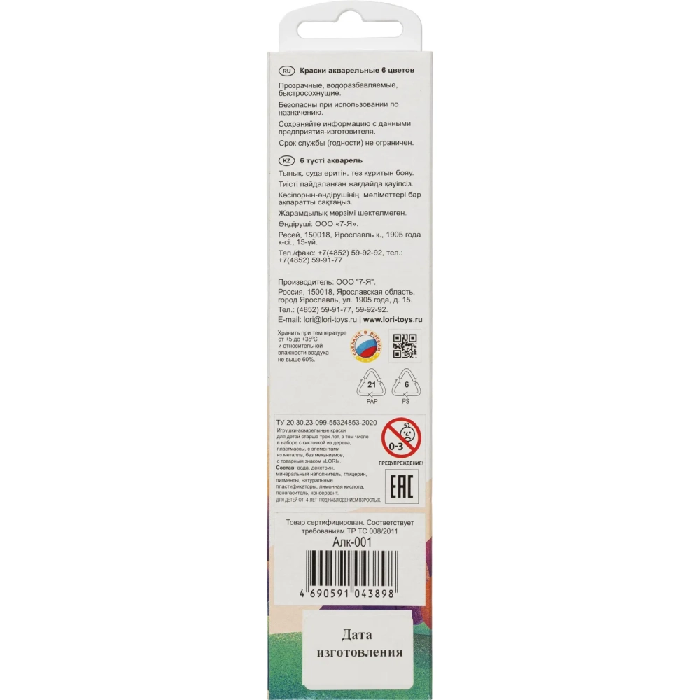 Краски акварельные 6 цветов, б/к Алк-001 набор