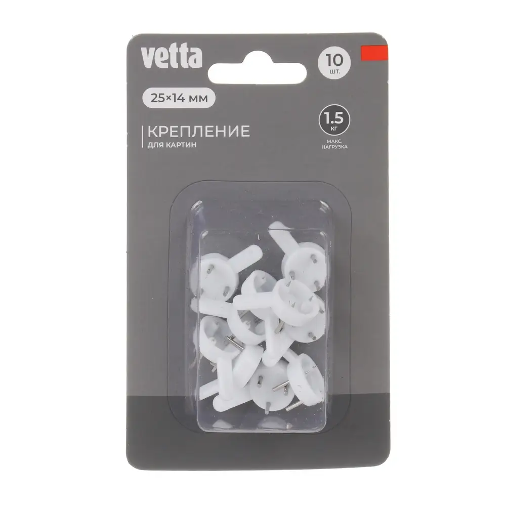 Крепление для картин VETTA используется для размещения на стенах небольших рисунков, фотографий в легких рамках и багетах не более 1,5 кг весом. Крепеж 25x14 мм круглой формы сделан из белого пластика с установленными в отверстия закаленными, прочными гвоздями. Для установки крепление нужно приложить к стене и осторожно вбить гвозди молотком. В наборе 10 шт.