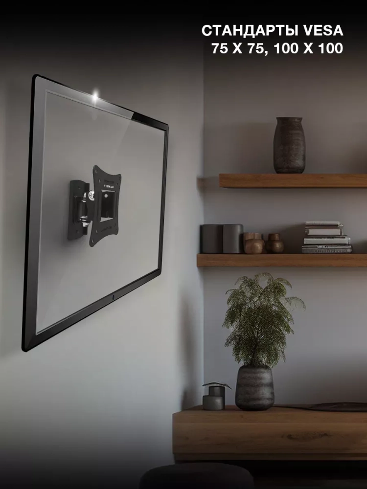 Компактный наклонно-поворотный кронштейн Hyundai GL-R1 – идеальный вариант для размещения на стене любого телевизора с диагональю экрана 20-29 дюймов весом до 15 кг, оснащенного креплениями стандарта VESA 75х75 и 100х100. Крепежная площадка самого кронштейна размером всего 106х55 мм позволит расположить его на небольшом участке стены. Отличительной особенностью кронштейна Hyundai GL-R1 является постоянное расстояние от стены до ТВ 6 см. Это обеспечивает экономию свободного пространства в помещении и безопасность установки. Кронштейн Hyundai GL-R1 позволит легко подобрать оптимальное положение экрана для просмотра, поворачивая висящий на стене телевизор до 45 градусов влево и вправо, на 5 градусов вверх и 15 градусов вниз. Стильный черный настенный кронштейн для ТВ Hyundai GL-R1 будет гармонично смотреться в любом интерьере. Его функционал позволит закрепить телевизор в наиболее подходящем месте и на удобной высоте, сохранив комфортный угол обзора экрана.