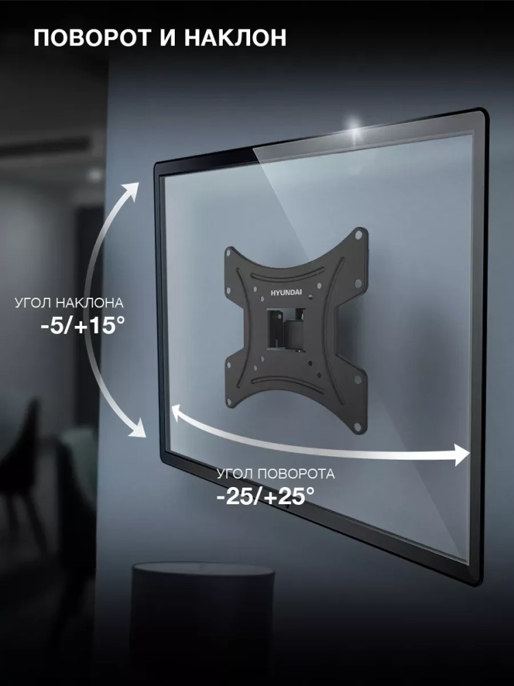 Кронштейн Hyundai GL-R2 позволит легко подобрать оптимальное положение экрана для просмотра, поворачивая висящий на стене телевизор до 25 градусов влево и вправо, на 5 градусов вверх и 15 градусов вниз.
