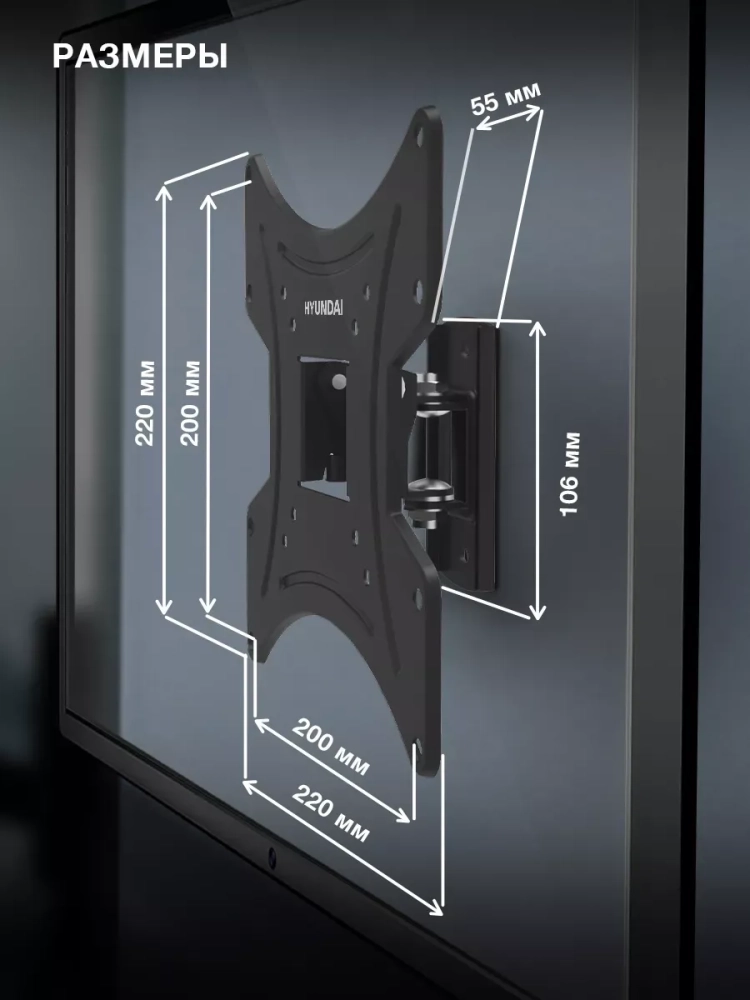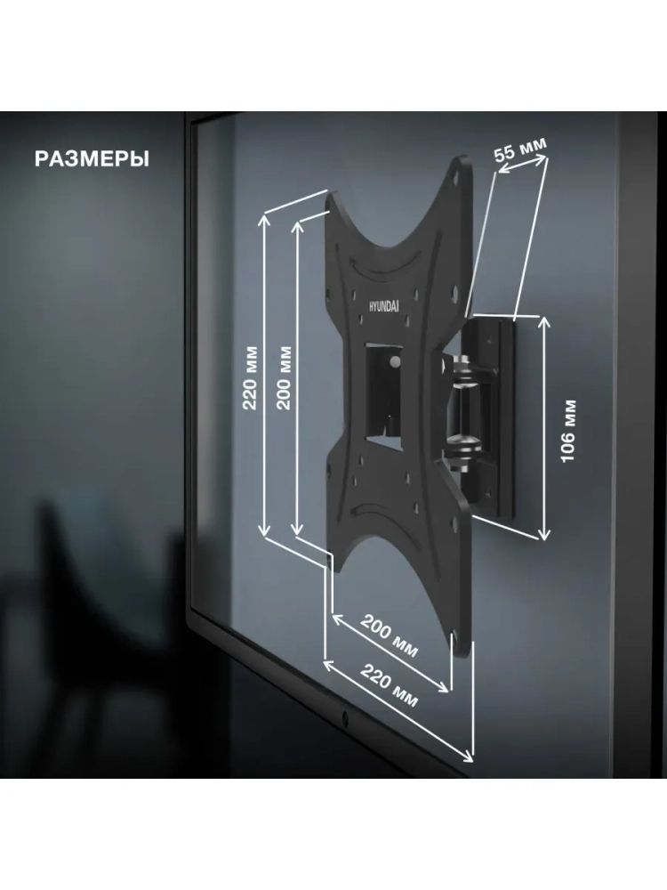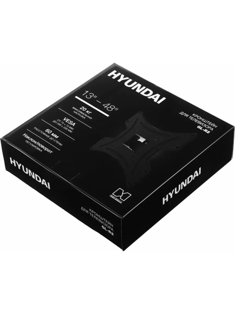 Компактный наклонно-поворотный кронштейн Hyundai GL-R2 – идеальный вариант для размещения на стене любого телевизора с диагональю экрана 13-48 дюймов весом до 20 кг, оснащенного популярными креплениями VESA 75х75, 100х100, 200х100 и 200х200. Крепежная площадка кронштейна габаритами 106х55 мм позволит расположить его на небольшом участке стены.