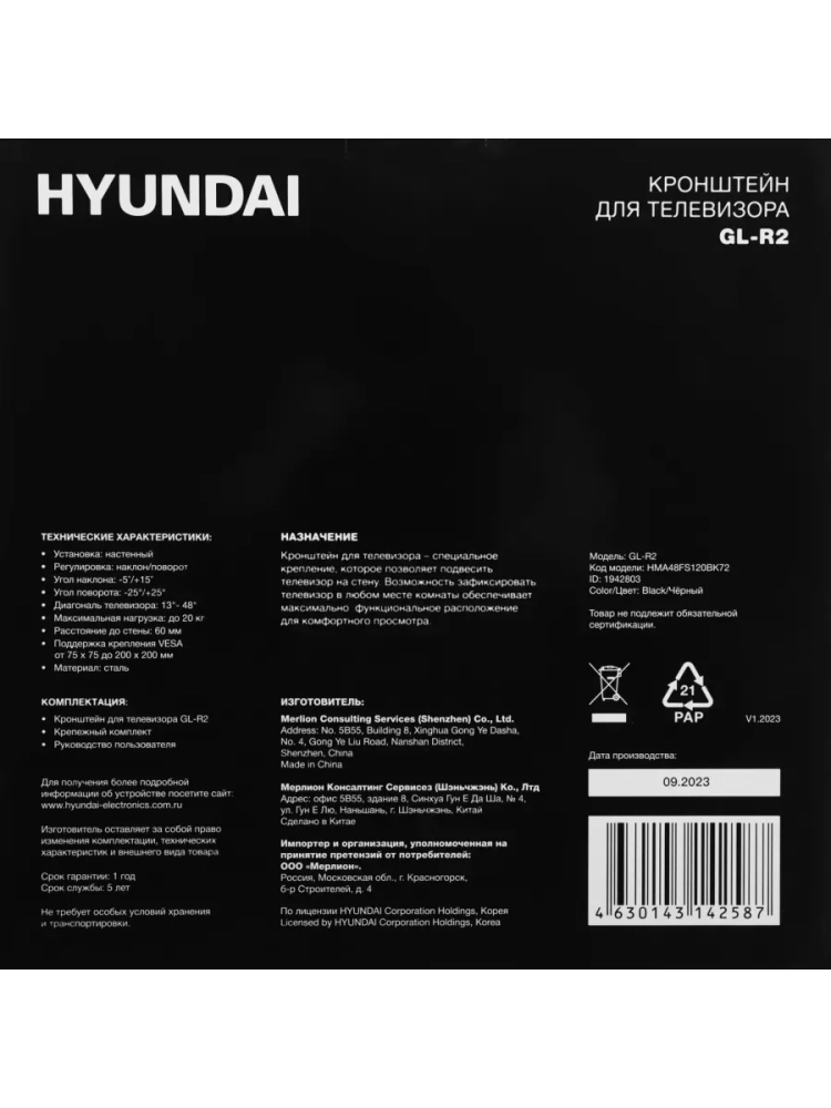 Стильный черный настенный кронштейн для ТВ Hyundai GL-R2 будет гармонично смотреться в любом интерьере. Его функционал позволит закрепить телевизор в наиболее подходящем месте и на удобной высоте, сохранив комфортный угол обзора экрана.