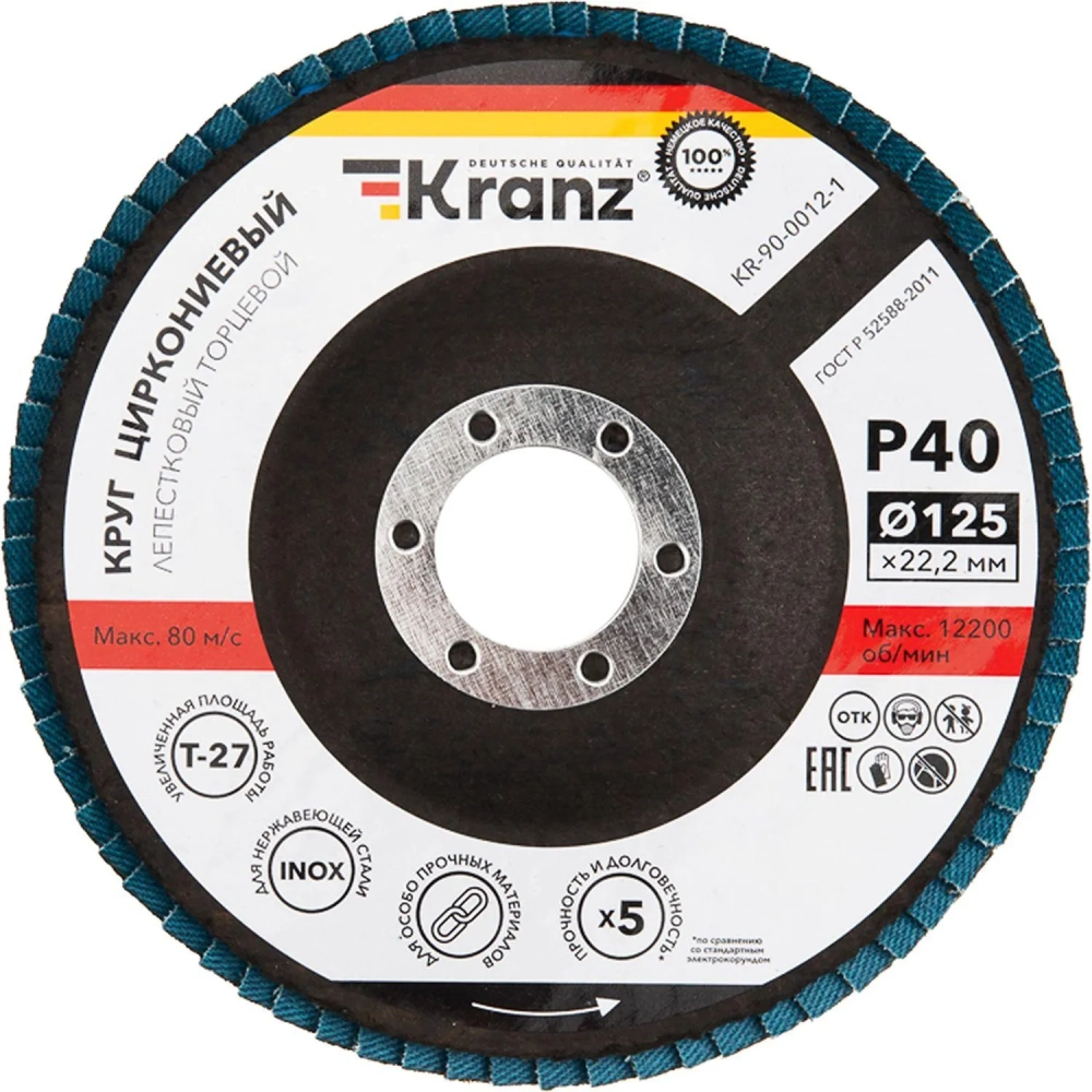 Круг лепестковый торцевой, циркониевый, P40, 125х22,2мм INOX KRANZ