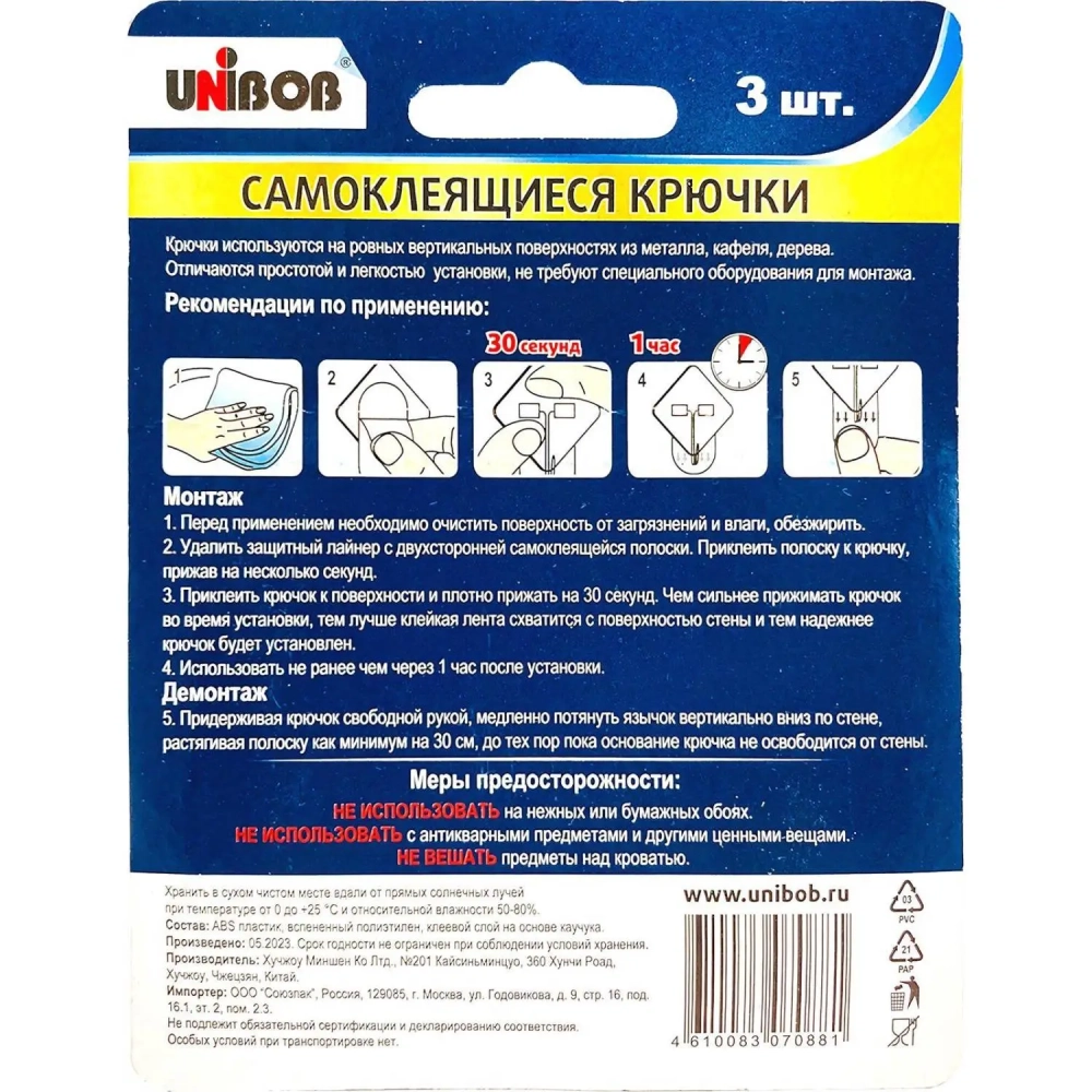 Крючок самоклеющийся подвижный с системой бесследнего удаления, 3 шт/упак