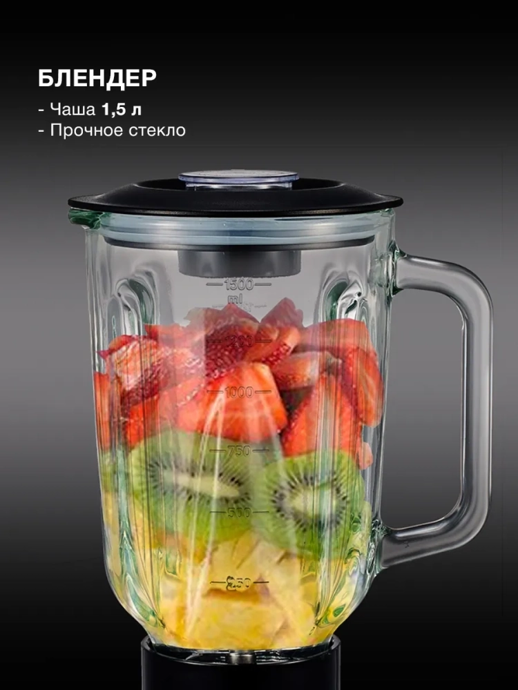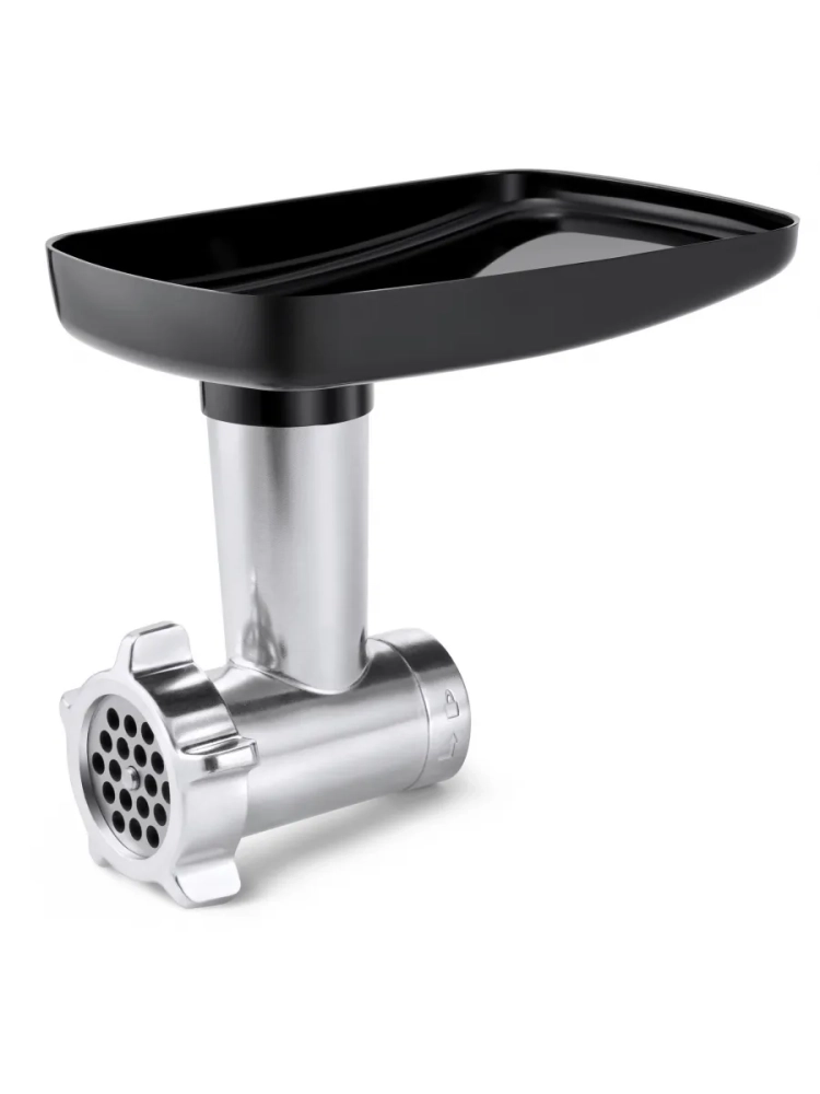 Комплектация: кухонная машина; чаша; защитная крышка для чаши; насадка-венчик; насадка-крюк; насадка-лопатка; насадка-блендер; насадка-мясорубка; 2 диска для фарша; книга рецептов; инструкция с гарантийным талоном.