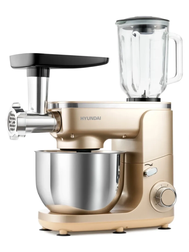 Кухонная машина Hyundai HYMS7451, планетарное вращение, мощность 1400Вт, количество скоростей 6, насадок 5, золотистый.