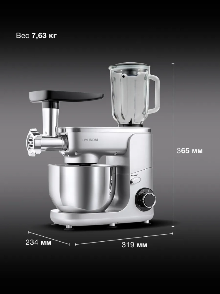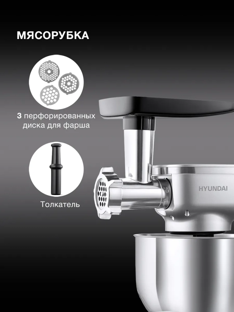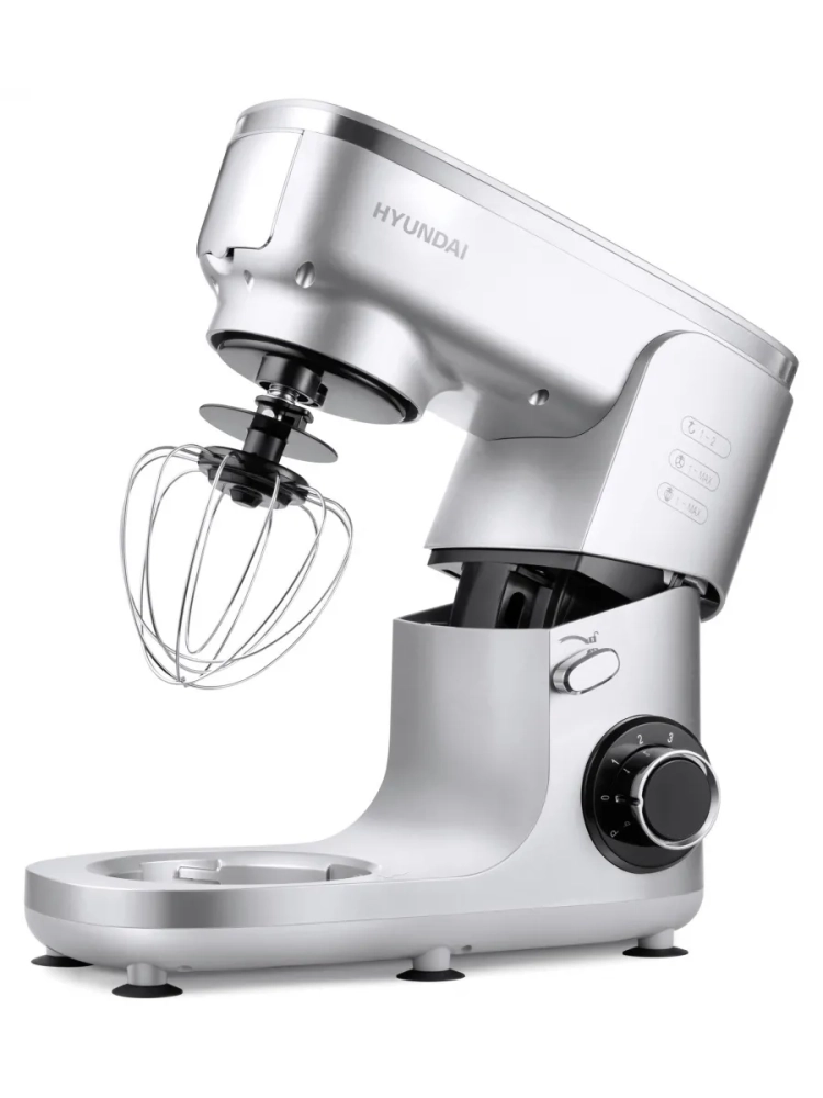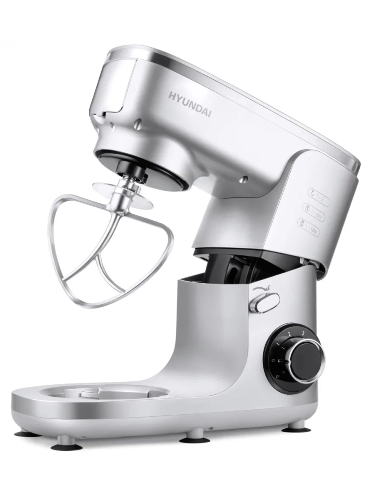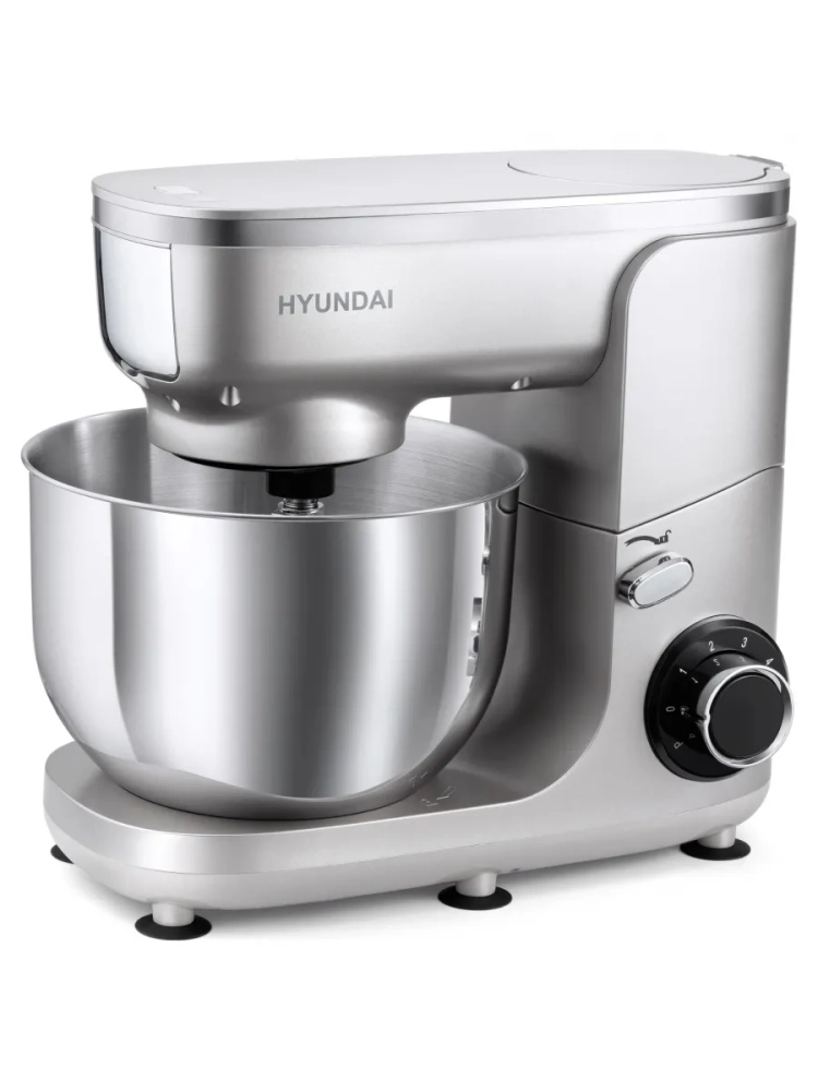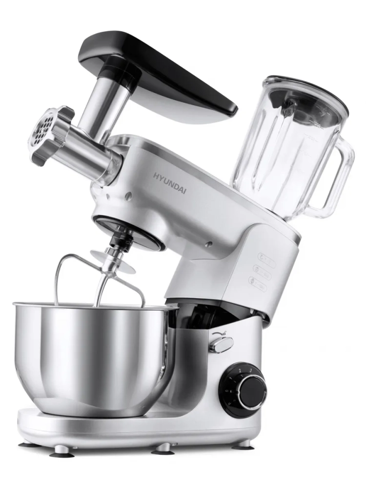 Кухонная машина Hyundai HYMS7651, планетарное вращение, мощность 1400Вт, количество скоростей 6, насадок 5, серебристый. Регулировка скорости. Максимальное время непрерывной работы 8 мин.