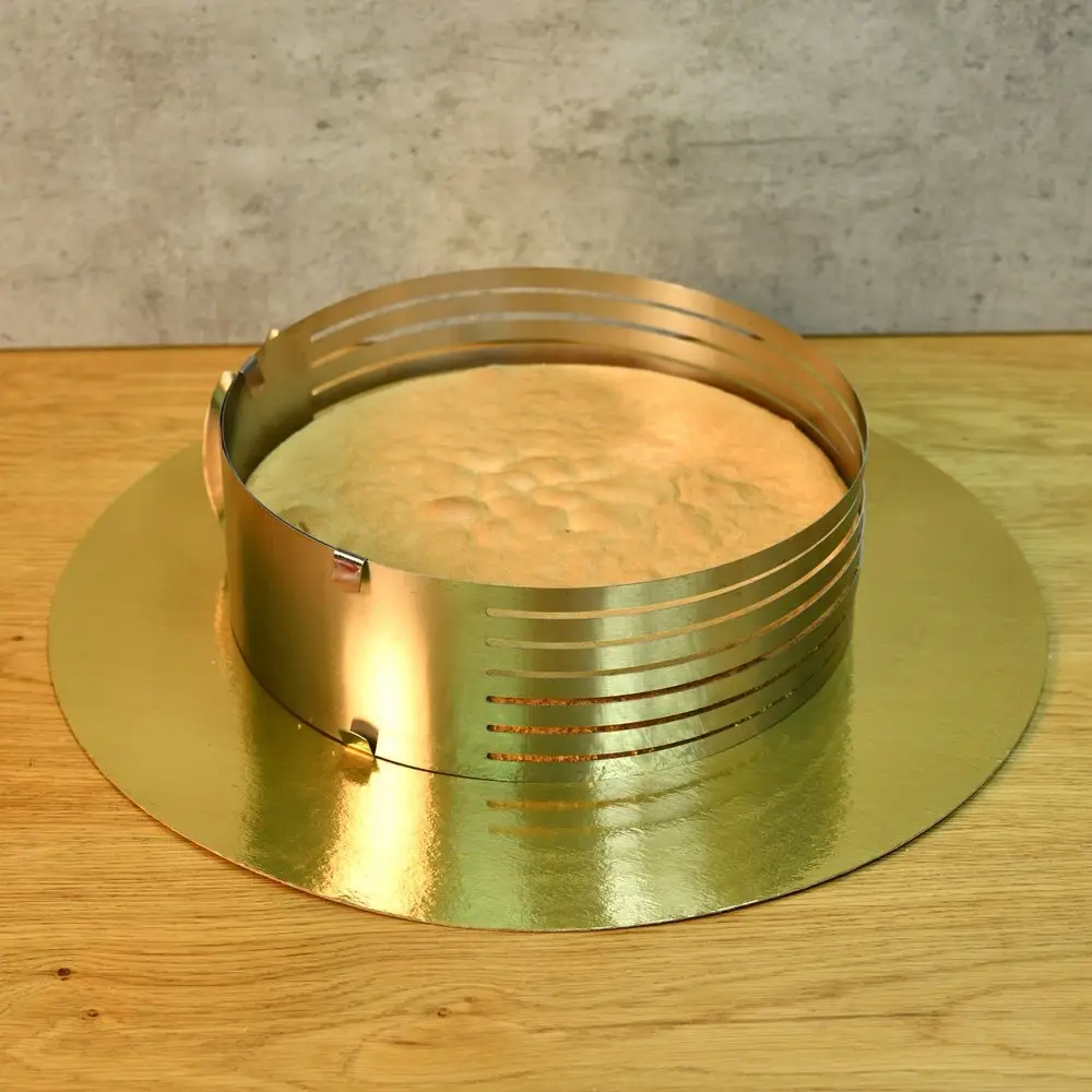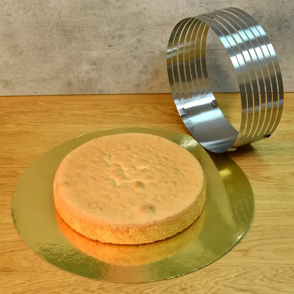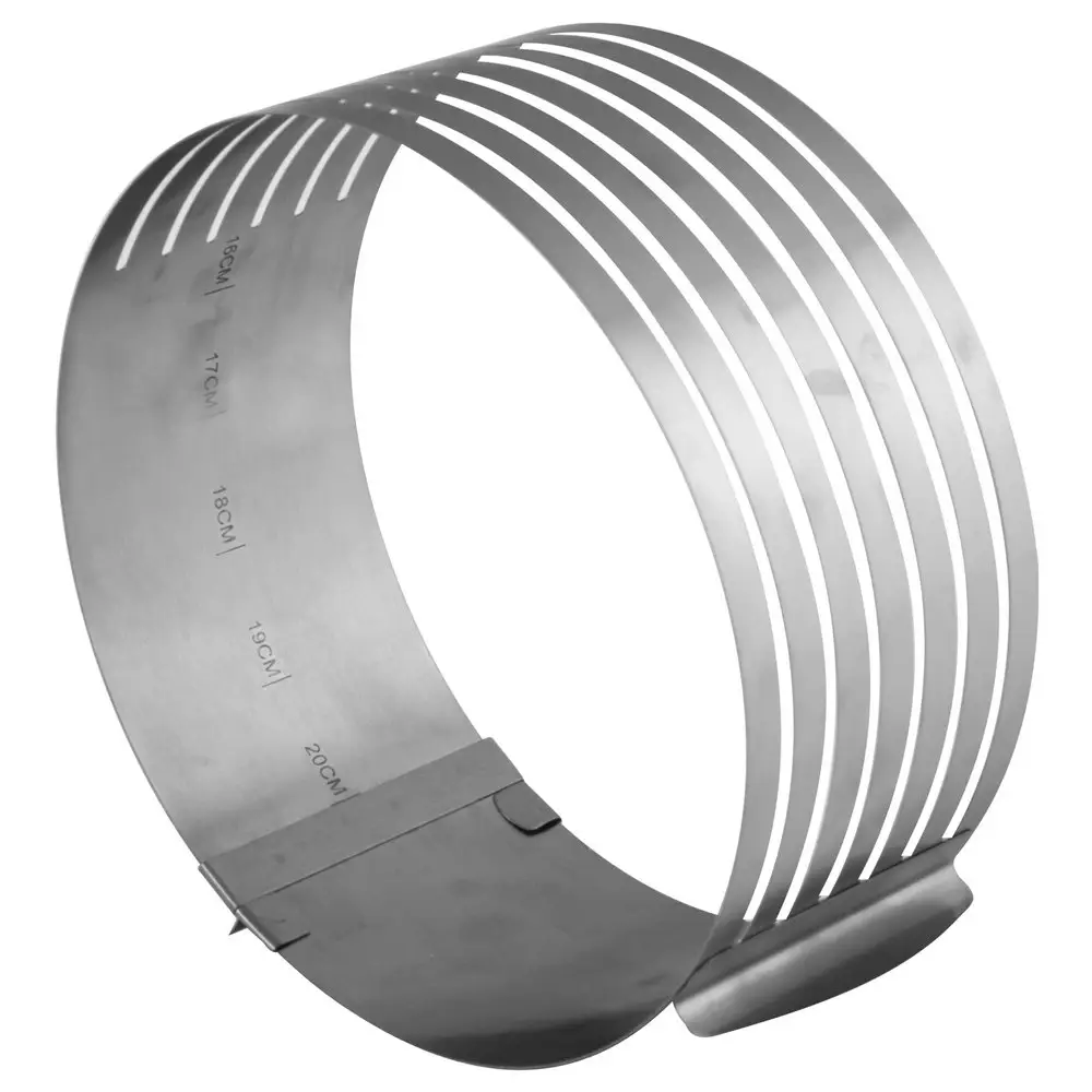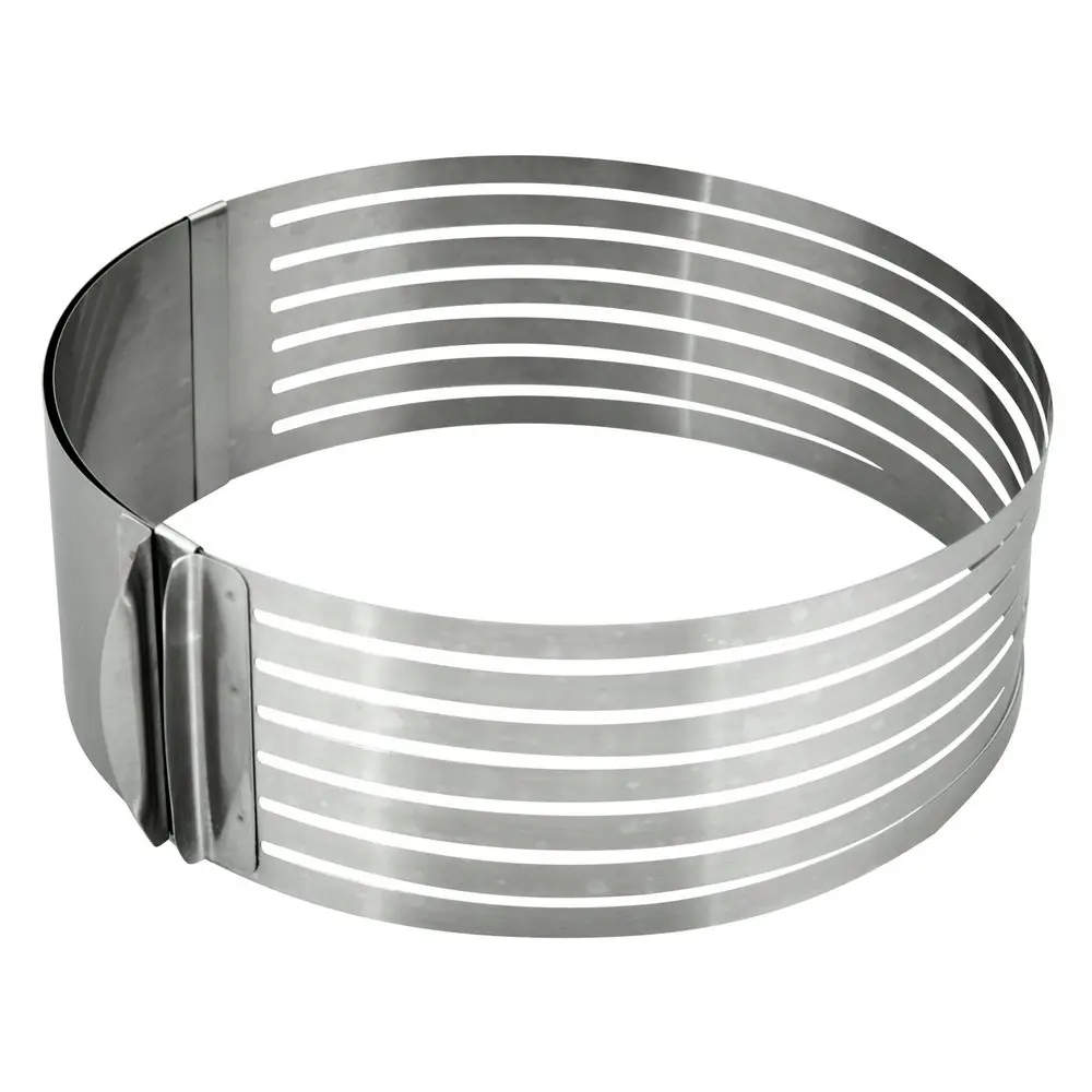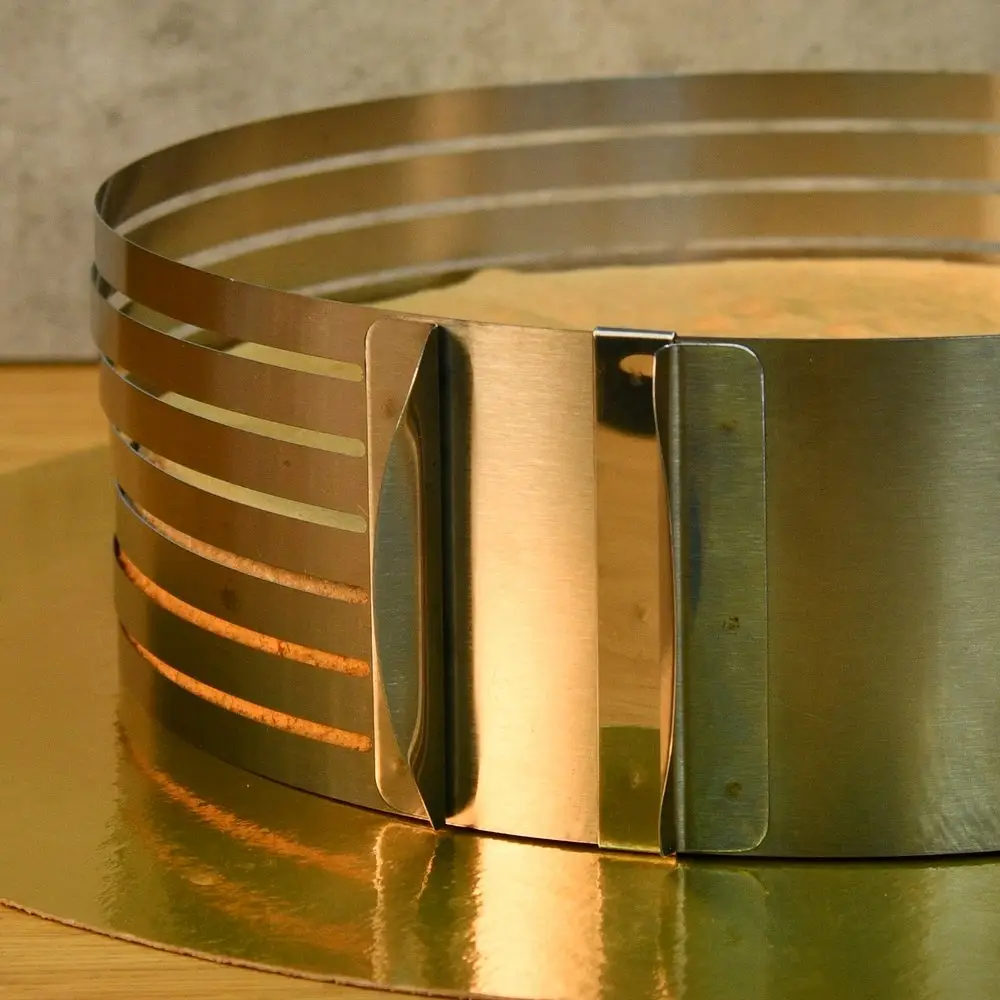 Кулинарная форма для нарезки коржей поможет аккуратно справиться со сложной задачей — нарезкой бисквита на одинаковые коржи. Тонкий бисквит идеально подходит для приготовления тортов, пирожных. Запеките тесто в обычной форме любой высоты, а затем разрежьте его! Поместите в форму с отверстиями готовый бисквит, при необходимости отрегулируйте диаметр. Аккуратно нарежьте заготовку через прорези с помощью острого длинного ножа, в результате у вас получится 7 коржей одинакового размера. Процесс нарезания максимально прост и займет у вас минимум времени. Диаметр слайсера регулируется от 24 до 30 см, внутри есть отметки для удобства регулировки, высота 8,5 см. После использования промойте изделие с моющим средством и высушите. Слайсер изготовлен из коррозионностойкой стали. Для регулировки диаметра разведите обе части ручки-держателя в разные стороны и зафиксируйте в нужном размере с помощью ползунка-стоппера.