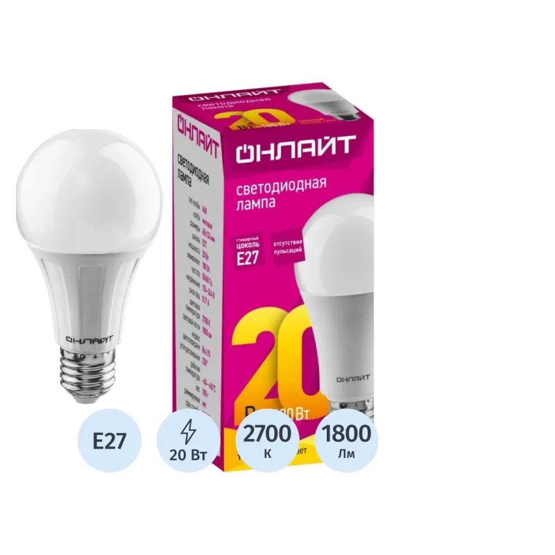 Лампа светодиодная ОНЛАЙТ OLL-A60-20-230-2.7K-E27 20Вт Е27 2700К 61157