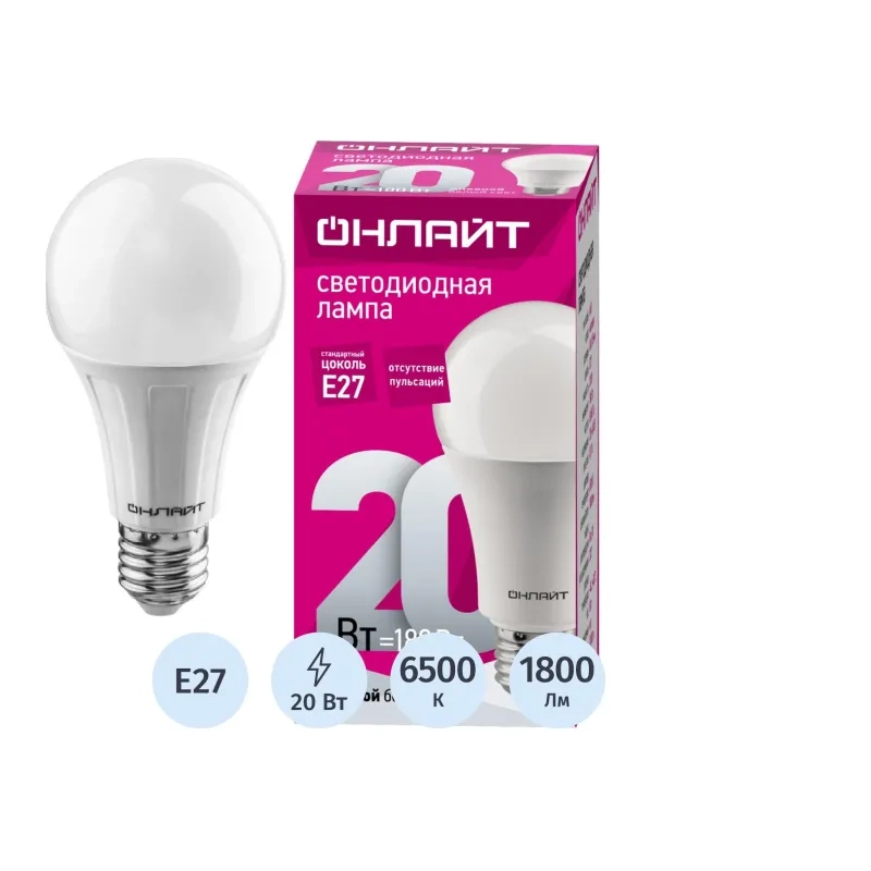 Лампа светодиодная ОНЛАЙТ OLL-A60-20-230-6.5K-E27 20Вт Е27 6500К 61159