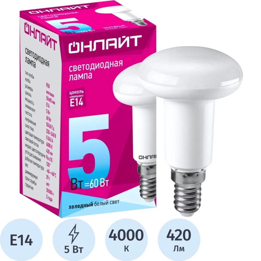 Лампа светодиодная ОНЛАЙТ OLL-R50-5-230-4K-E14 5Вт E14 4000К 71652