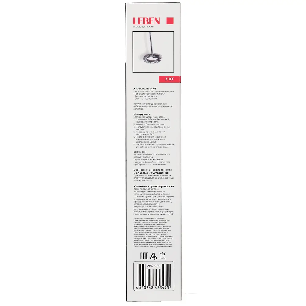 Капучинатор от бренда LEBEN — это компактный, удобный и практичный прибор для взбивания молока, который поможет легко приготовить вкусный капучино, латте или другие кофейные напитки в домашних условиях. Изготовлен из прочного металла и пластика. Работает от двух батареек типа AA, не требует подключения к сети, что делает его мобильным и удобным в использовании на кухне, в поездке или на даче. Прибор оснащён одной насадкой с нержавеющей стальной спиралью, которая эффективно взбивает молоко, создавая густую, воздушную пенку за считанные секунды. Мощность 3 Вт обеспечивает достаточную производительность для быстрого и равномерного взбивания. Простое управление. С LEBEN ваш кофе станет ещё вкуснее — без лишних хлопот и дорогостоящих устройств. Просто, быстро, качественно.