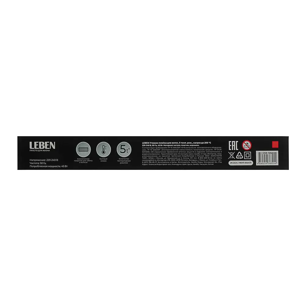 LEBEN Утюжок-плойка для волос, 5 темп.реж, нагрев до 200°, 45Вт/50Гц/240В, пластик, металл, кер