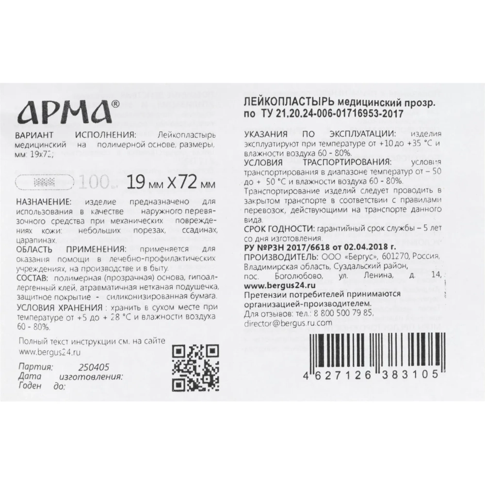 Лейкопластырь,19х72мм полимер.прозрач.ПЭ,100 шт/уп,АРМА