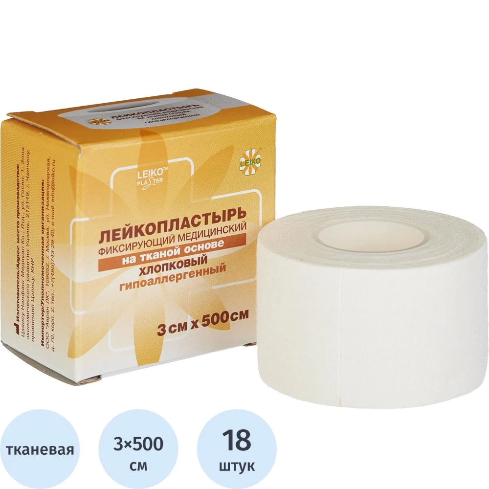 Лейкопластырь 3х500см тканевый в картон LEIKO, 18 шт/уп