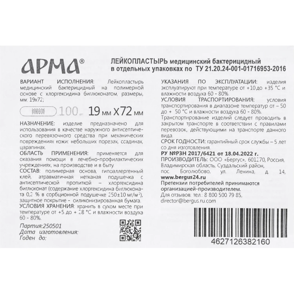 Лейкопластырь бакт,19х72мм полимер.телесный ПЭ,100шт/уп,АРМА