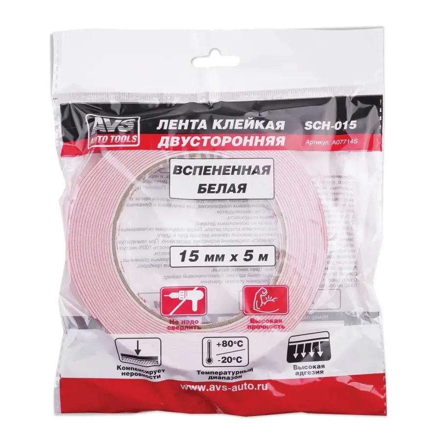 Лента клейкая двусторонняя AVS SCH-015 15 mm x 5 m вспененная основа (белая)