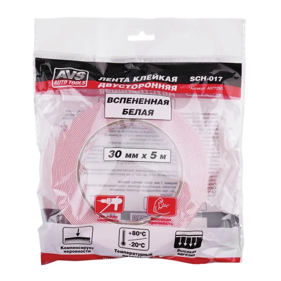 Лента клейкая двусторонняя AVS SCH-017 30 mm x 5 m вспененная основа (белая)