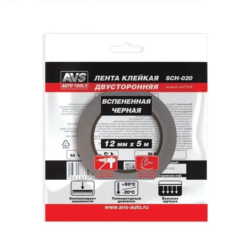 Лента клейкая двусторонняя AVS SCH-020 12 mm x 5 m вспененная основа (черная)