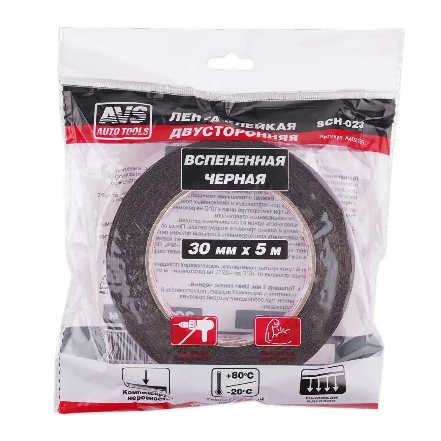 Лента клейкая двусторонняя AVS SCH-023 30 mm x 5 m вспененная основа (черная)