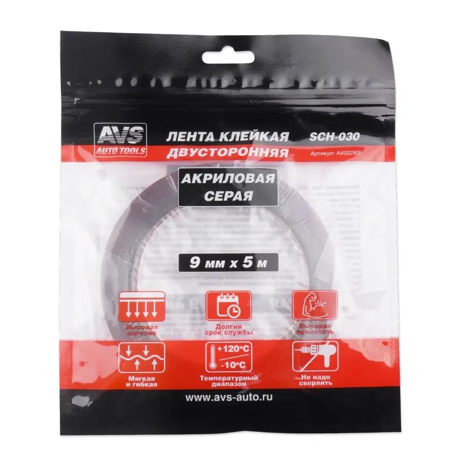 Лента клейкая двусторонняя AVS SCH-030 9 mm x 5 m акриловая основа (серая)