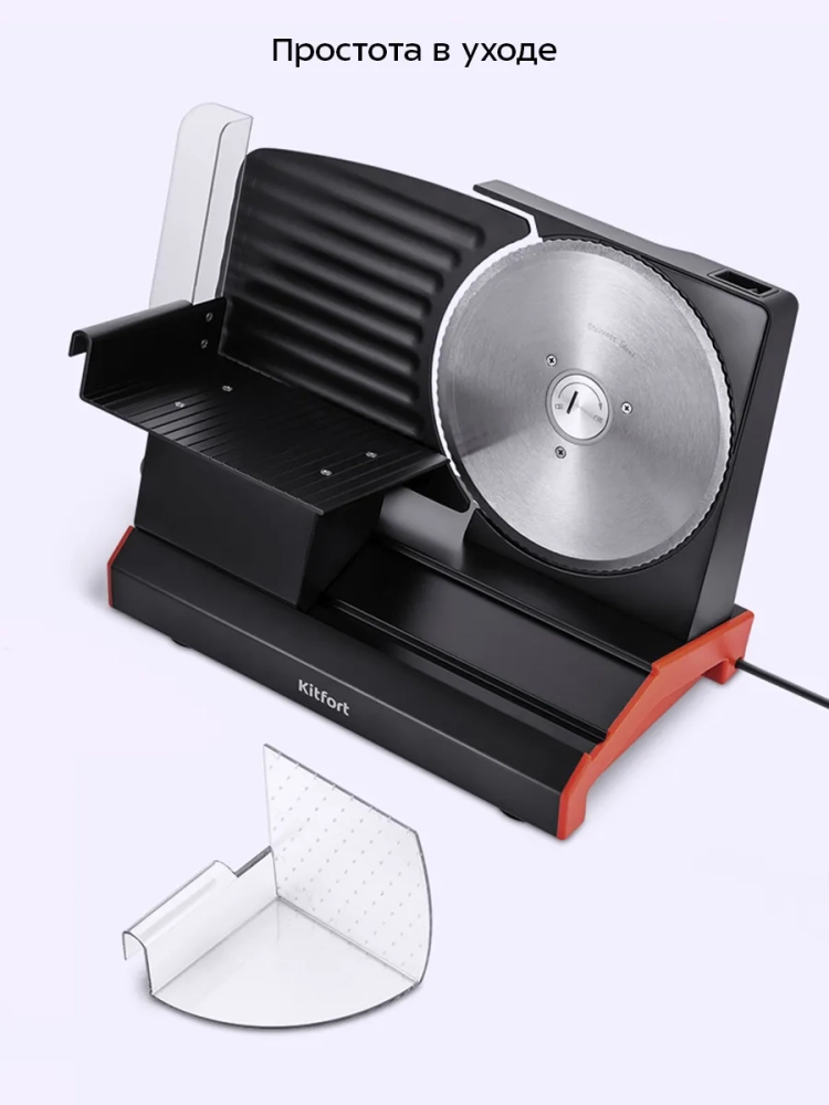 Дисковый нож легко снять для заточки или очистки. Части устройства, непосредственно контактирующие с продуктом, съемные, поэтому их удобно мыть, не беспокоясь о том, что вода может попасть в корпус устройства и вывести его из строя.