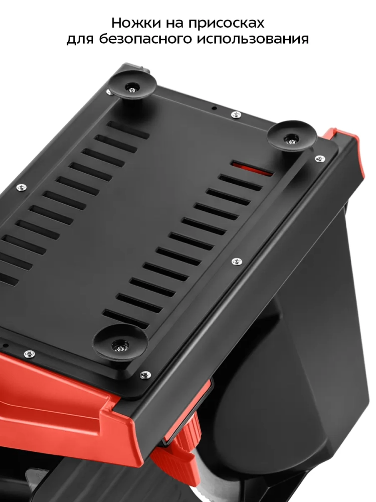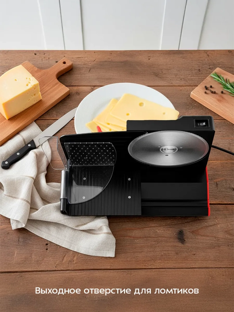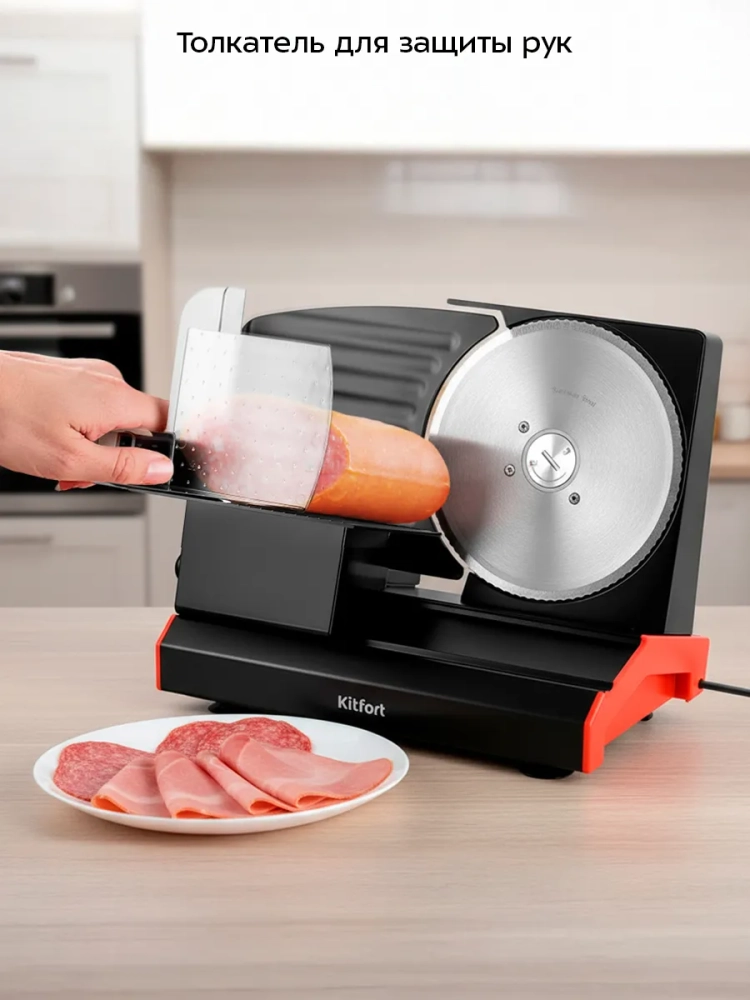 Принцип работы ломтерезки прост: при включении устройства дисковый нож начинает вращаться, и, когда вы пододвигаете каретку с продуктом к ножу, отрезается ломтик необходимой толщины. Нож выполнен из нержавеющей стали и имеет волнообразный край. Толщина нарезки определяется зазором между дисковым ножом и ограничителем. В ломтерезке КТ-9952 толщину ломтиков можно плавно регулировать от 1 до 22 мм. Для безопасной работы предусмотрен пластиковый толкатель, который позволяет пододвигать продукт к дисковому ножу.