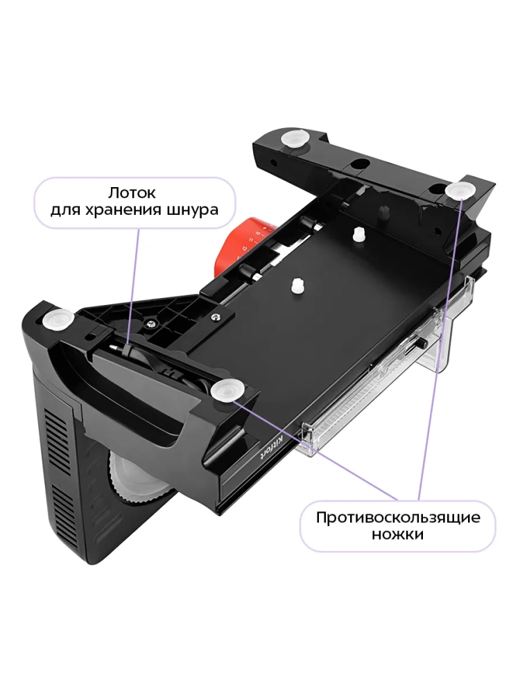 Корпус данной модели выполнен из алюминия, что делает устройство более надежным и долговечным. Снизу прибора предусмотрены противоскользящие ножки с присосками для устойчивости. С правой стороны на дне прибора расположен отсек для хранения шнура.