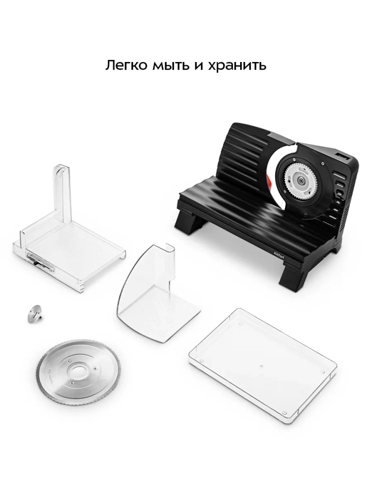 Дисковый нож легко снять для заточки или очистки. Части устройства, непосредственно контактирующие с продуктом, съемные. Их удобно мыть, не беспокоясь о том, что вода может попасть в корпус устройства и вывести его из строя.