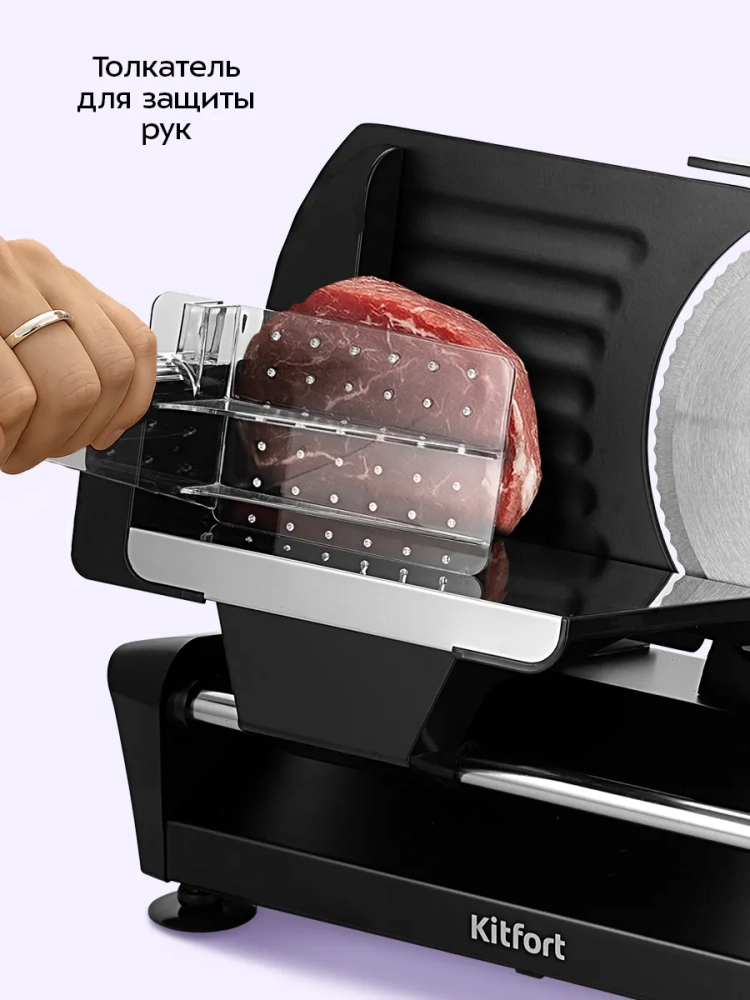 Принцип работы ломтерезки прост: при включении устройства дисковый нож начинает вращаться, и, когда вы пододвигаете каретку с продуктом к ножу, отрезается ломтик необходимой толщины. Нож выполнен из нержавеющей стали и имеет волнообразный край. Толщина нарезки определяется зазором между дисковым ножом и ограничителем. В ломтерезке КТ-9955 толщину ломтиков можно плавно регулировать от 1 до 22 мм. Для безопасной работы предусмотрен пластиковый толкатель, который позволяет пододвигать продукт к дисковому ножу.