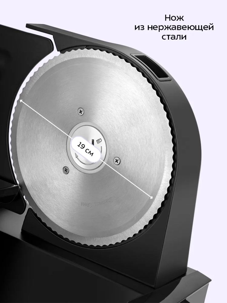 Дисковый нож легко снять для заточки или очистки. Толкатель, непосредственно контактирующий с продуктом, также съемный, что облегчает очистку устройства. Снизу прибора предусмотрены противоскользящие ножки с присосками для устойчивости.