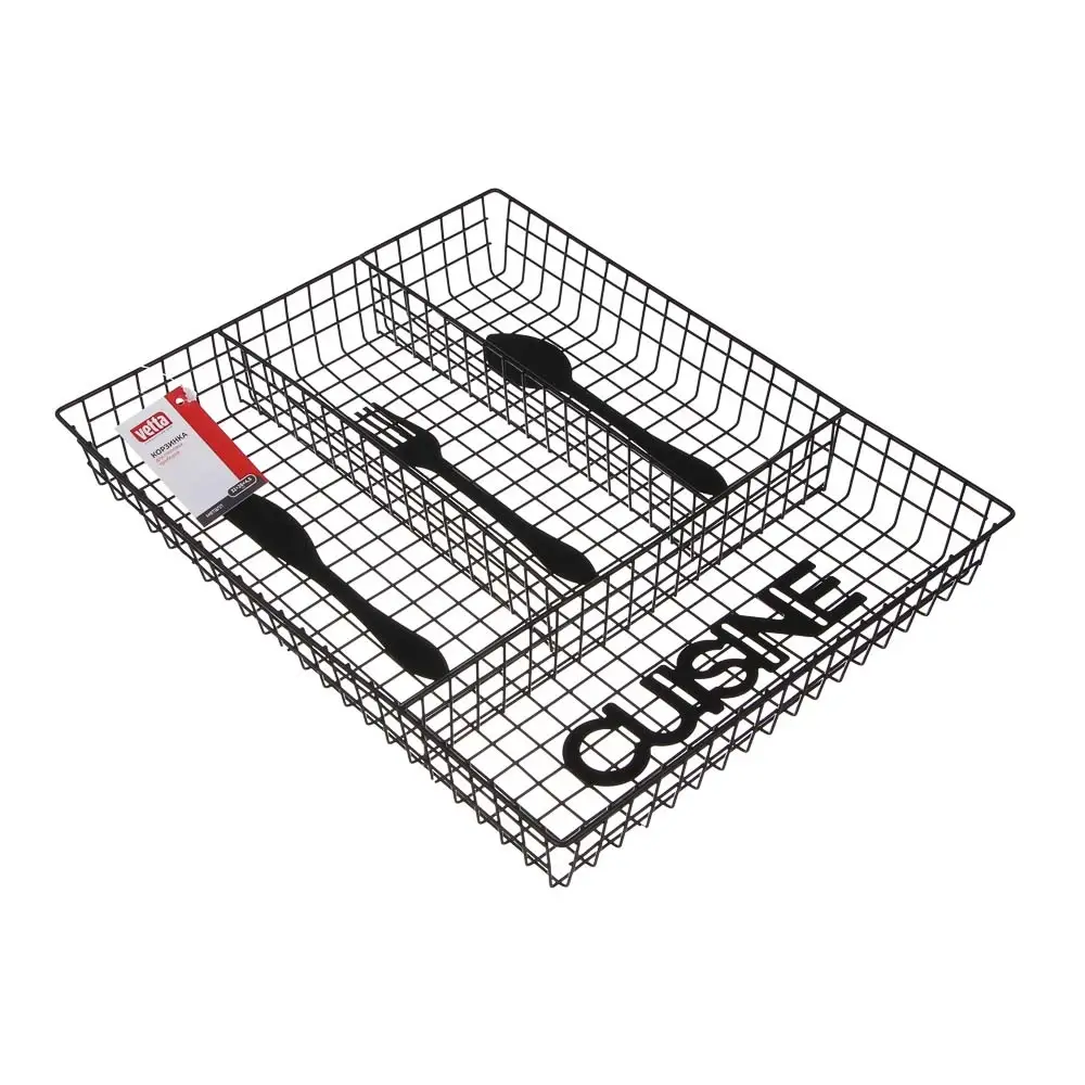 Лоток для столовых приборов VETTA «Кухня» предназначена для хранения столовых приборов и содержит 4 отсека: для ложек, вилок, ножей и других предметов и аксессуаров, например, овощечистки, ножниц и точилки для ножей. Имеет универсальный размер и подойдет практически для любого выдвижного кухонного ящика. Изготовлена из металла, имеет приятный тематический дизайн и обеспечит порядок на кухне.