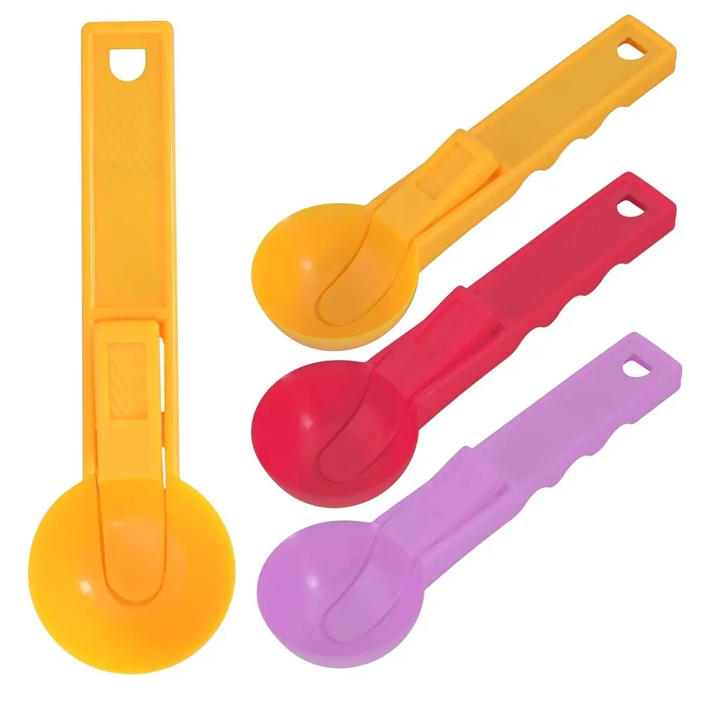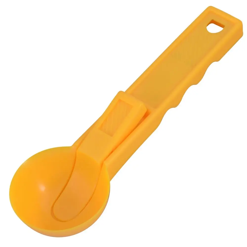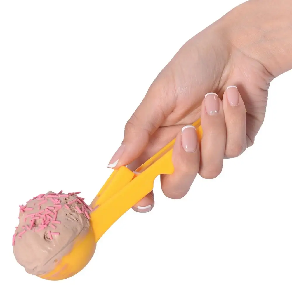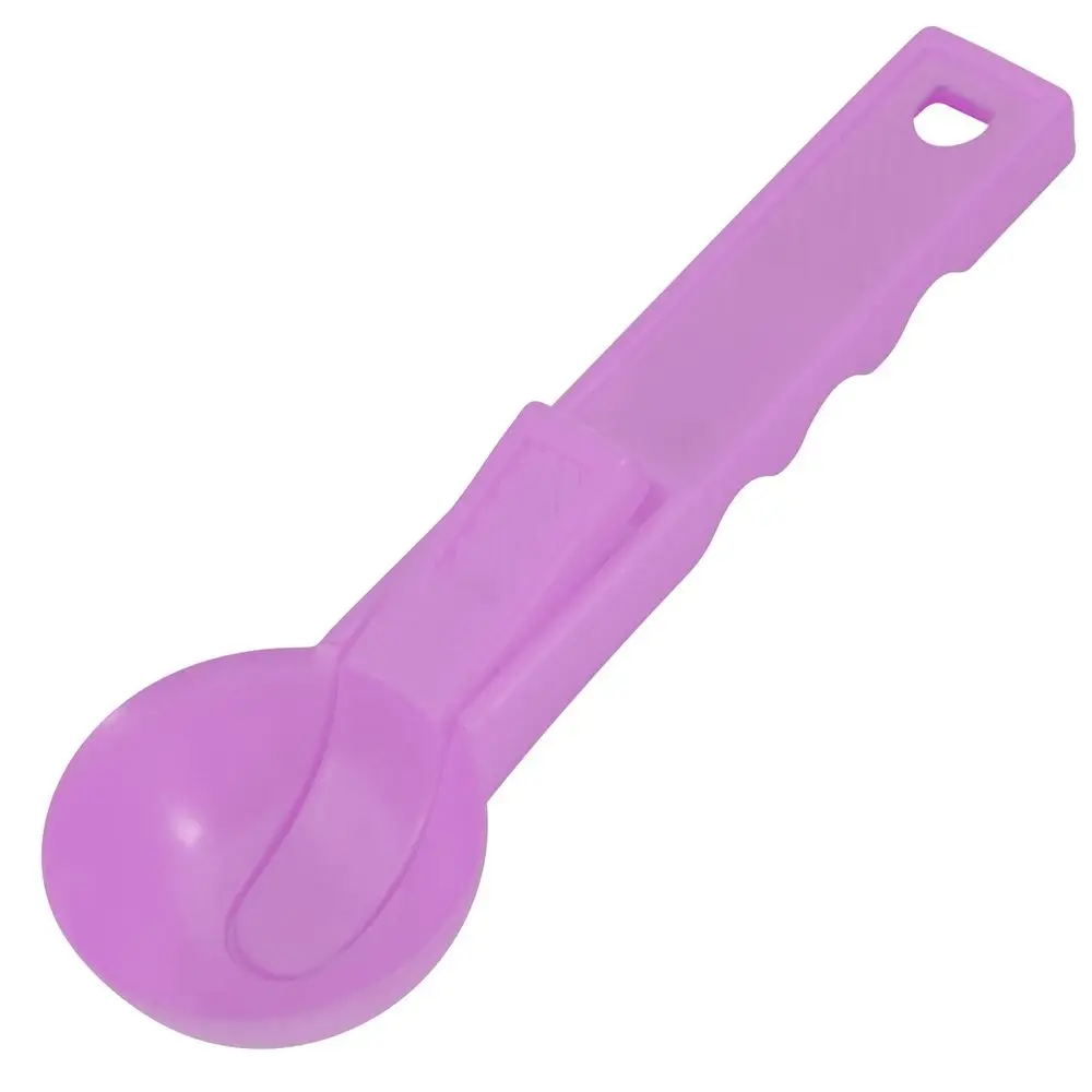 Как красиво оформить шарики мороженого? С помощью специальной ложки накладывать мороженое будет гораздо проще. Углубите ложку в мороженое, проведите вперед, шарик готов! Внимание! Чтобы мороженое хорошо снималось с ложки, каждый раз надо погружать ложку в заранее приготовленный стакан с горячей водой. Кнопка-выталкиватель позволяет одним движением вытолкнуть шарик, который не прилипнет и будет идеально ровным. Инструмент можно использовать для других десертов, для кремообразных холодных закусок и салатов. Стильный дизайн и возможность подвесить на крючок делают эту ложку удобным кухонным инструментом. Всегда под рукой для любимого десерта с мороженым для детей и взрослых. Проста в обращении, легко моется. Изготовлено: пластмасса (полистирол). Размер 18х5,5см.