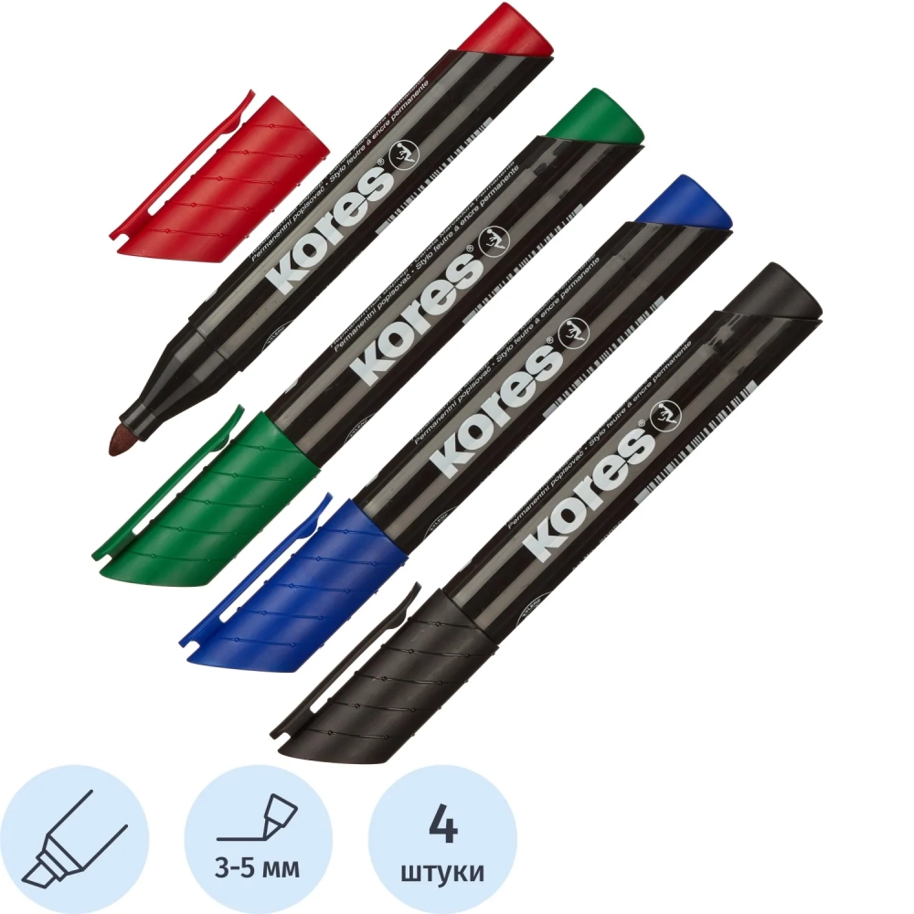 Маркер перманентный KORES набор 4 цв. 3-5 мм скошенный наконечник 20945