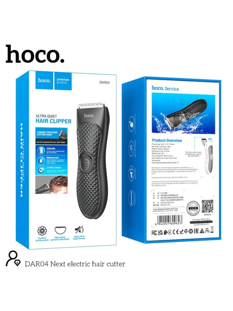 Машинка для стрижки волос DAR04 HOCO – это надежный помощник для создания стильных и аккуратных причесок в домашних условиях. Модель оснащена керамической режущей головкой с плотным зубом R-типа, которая обеспечивает точную и эффективную стрижку. В комплект входят две насадки (3мм/6мм и 9мм/12мм), позволяющие регулировать длину стрижки в соответствии с вашими предпочтениями. Литиевый аккумулятор 320 mAh обеспечивает до 45 минут автономной работы после полной зарядки за 120 минут. Корпус машинки выполнен из прочного ABS-пластика, что гарантирует ее долговечность, водонепроницаемость IPX6 ,что позволяет мыть машинку целиком в воде ,выдвижная головка лезвия помогает быстро и качественно промыть или очистить лезвия. Благодаря своей эргономичной конструкции и удобной форме, машинка легко ложится в руку и обеспечивает комфортное использование даже в течение длительного времени Благодаря своей функциональности, надежности и высокому качеству стрижки она пользуется популярностью среди профессионалов и обычных пользователей, которые ценят качество и удобство при уходе за своими волосами. Приобретая машинку DAR04 HOCO-вы получаете надежного помощника.