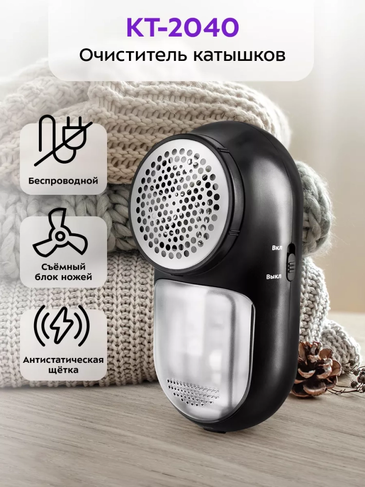 Иногда из-за частой и неправильной стирки или из-за примеси полиэстера в тканях на одежде появляются катышки. Очиститель катышков от Kitfort KT-2040 позволит сделать вашу одежду опять новой.
