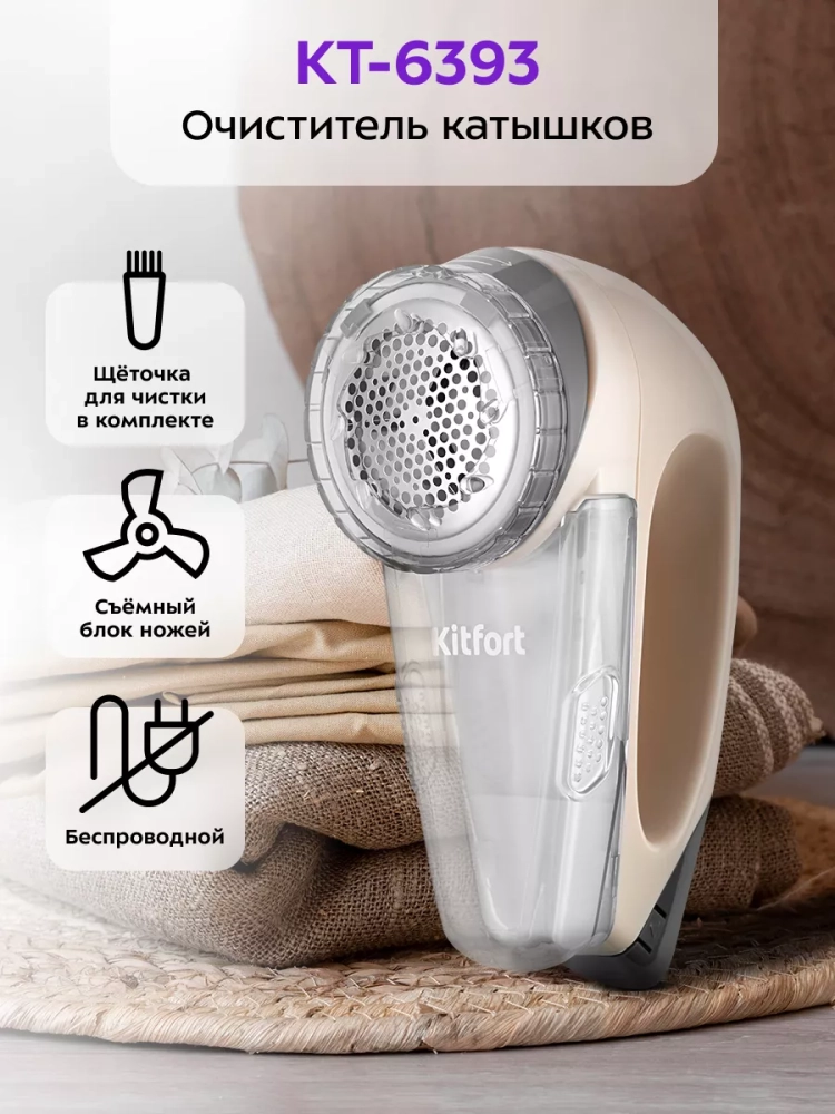 Машинка от катышек на одежде КТ-6393 — это незаменимый мощный помощник для поддержания вашего гардероба в идеальном состоянии. Очиститель катышков Kitfort KT-6393 эффективно удаляет катышки, которые появляются из-за неправильного ухода, частой стирки или износа тканей. Принцип работы полезного устройства напоминает электробритву: защищенный металлической сеткой блок ножей срезает комки ворса с поверхности ткани. Эти комки попадают в специальный контейнер объемом 60 мл, который легко очищается после каждого использования. Съемный блок ножей изготовлен из нержавеющей стали, что гарантирует долговечность и надежность прибора. Машинка для удаления катышков работает от двух батареек типа АА (в комплект не входят), что делает её удобной для использования как дома, так и в путешествиях или на работе. Легкий вес и эргономичная ручка обеспечивают комфортное использование. Машинка подходит для любых тканей: хлопка, шерсти или льна. Скорость вращения ножей составляет 6000 об/мин, что позволяет быстро и эффективно справляться с задачами любой сложности. Это устройство станет отличным решением для тех, кто хочет сохранить свою одежду ухоженной без лишних усилий. Если вы ищете машинку от катышек на одежде или машинку для удаления катышков с одежды — Kitfort KT-6393 станет вашим надежным выбором! Она также известна как машинка для удаления катышков или даже как универсальный "катышкоудалитель" благодаря своей эффективности и простоте использования.