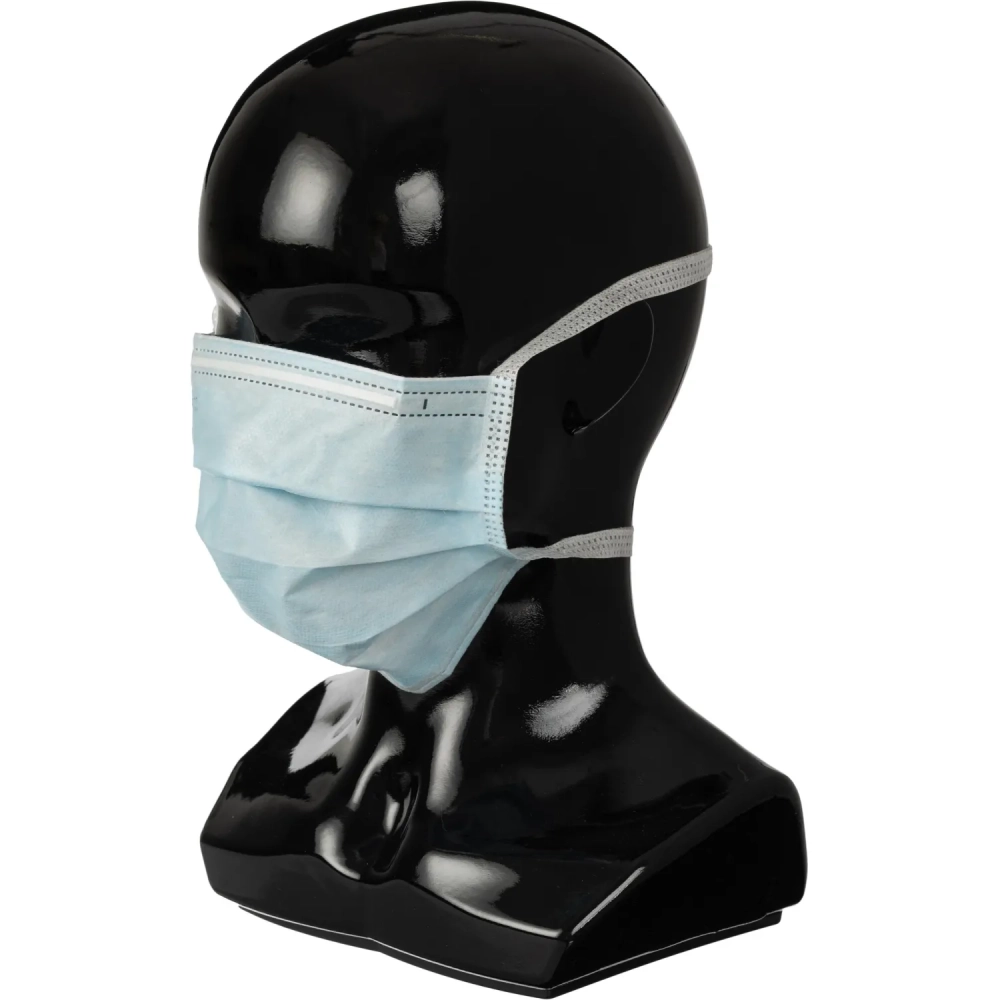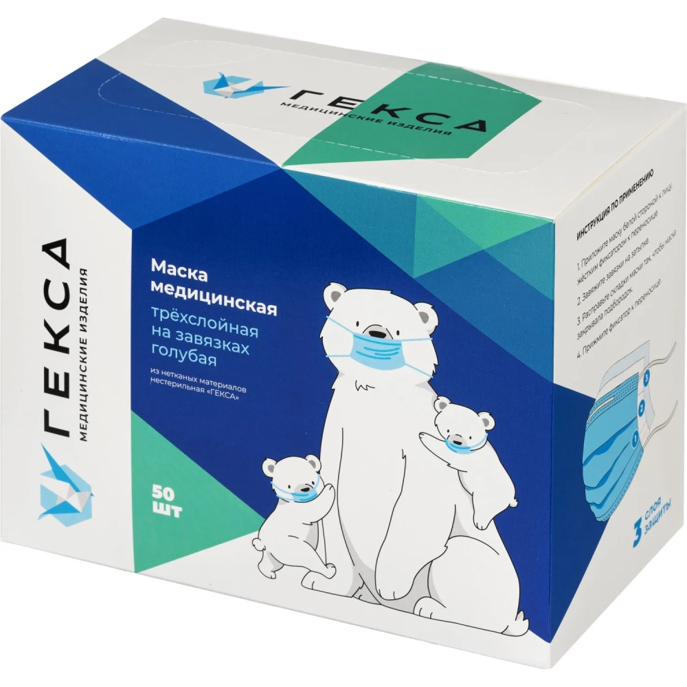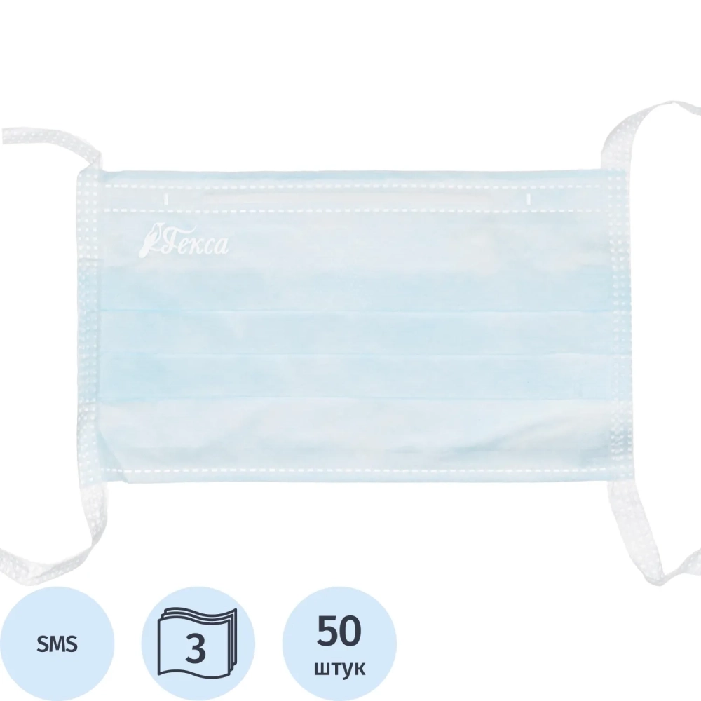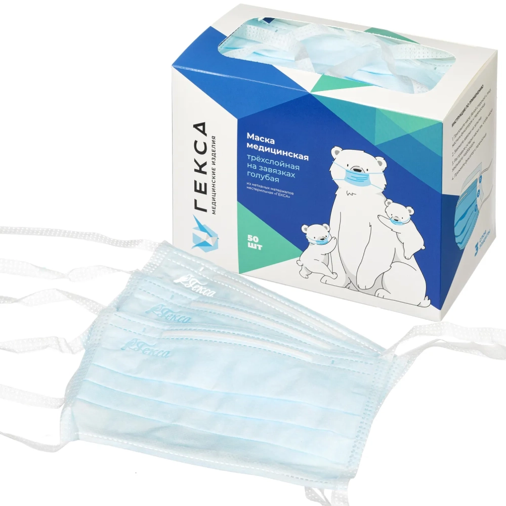 Маска мед трехслойная на завязках голубая, 50шт/уп Гекса
