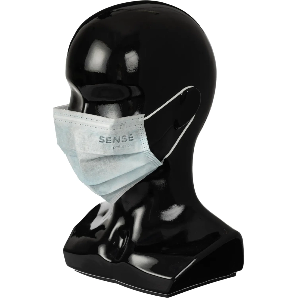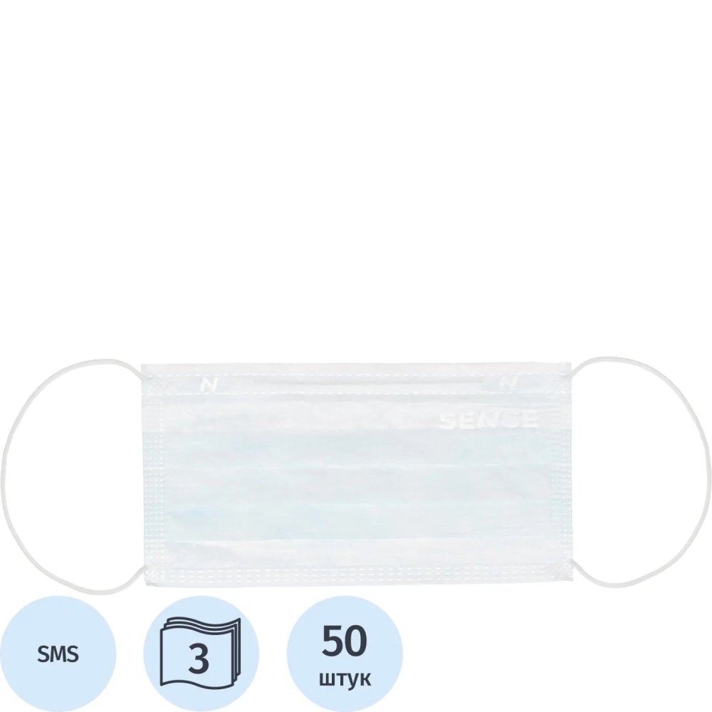 Маска медицинская 3-х сл., мельтб, резинки, голубая Sense, картон 50шт/уп