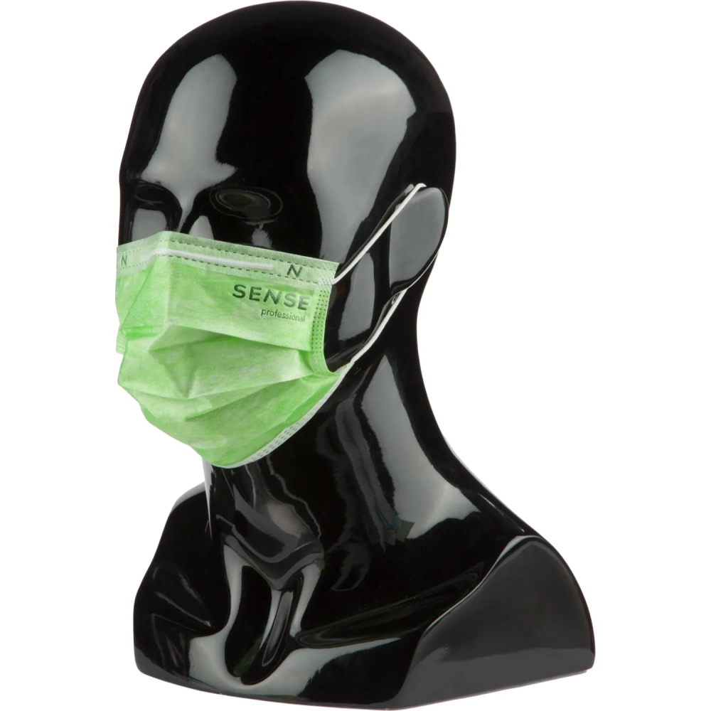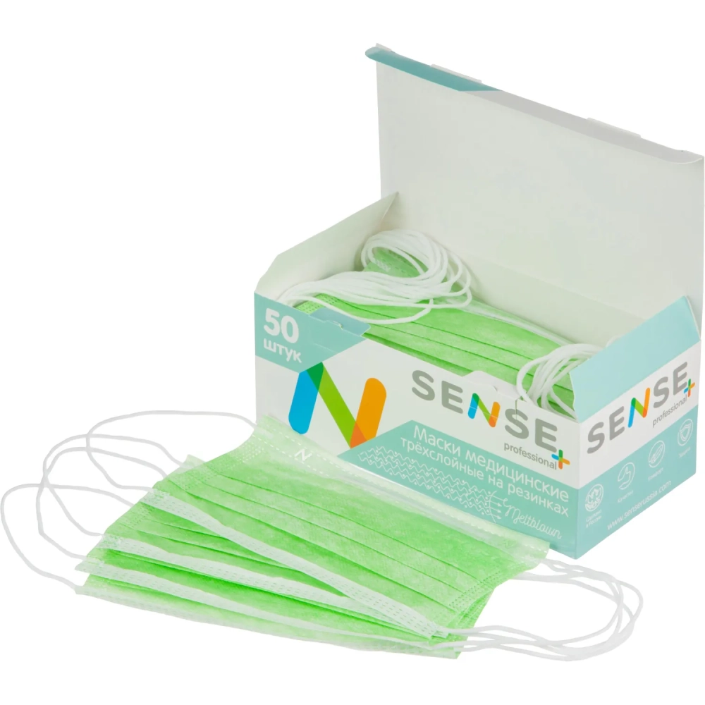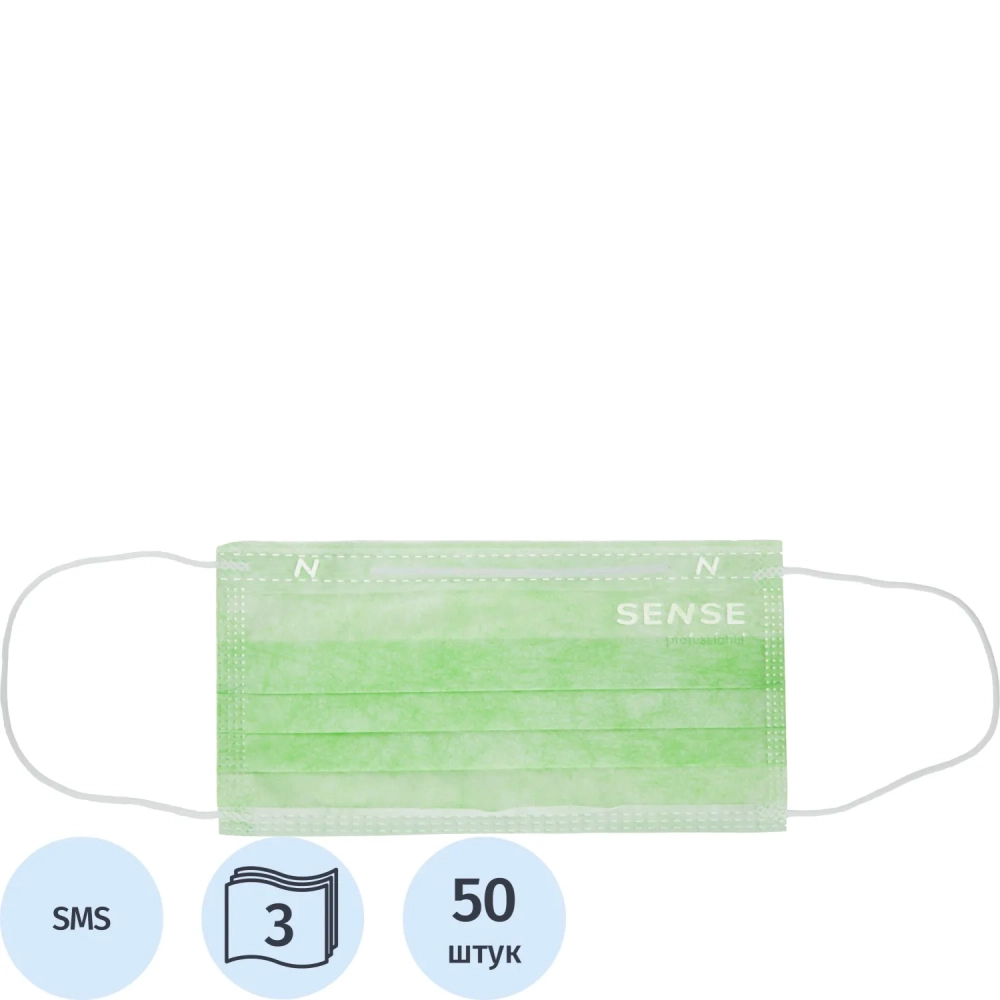 Маска медицинская 3-х сл., резинка, мятный/зеленый, Sense, картон 50шт/уп