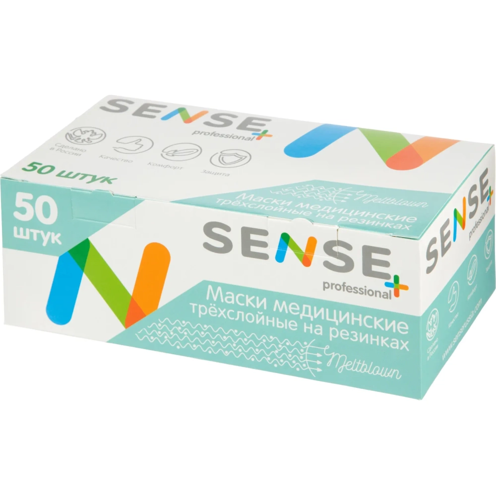 Маска медицинская 3-х сл., резинка, мятный/зеленый, Sense, картон 50шт/уп