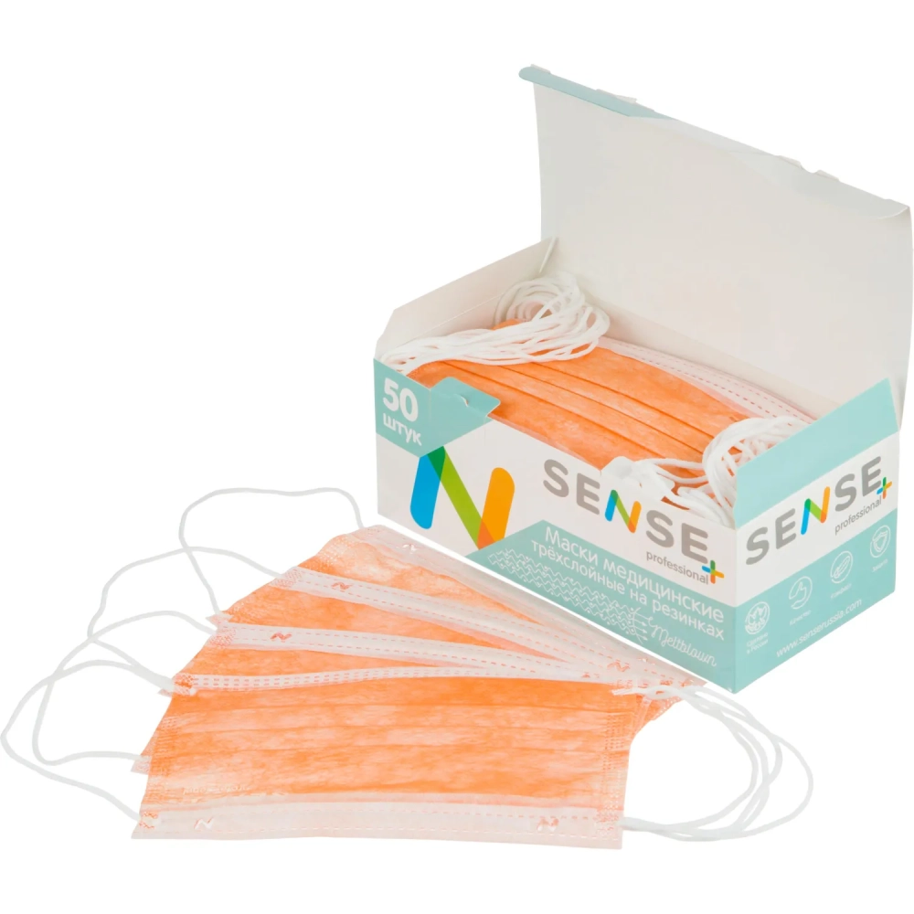 Маска медицинская 3-х сл., резинка, оранжевый, Sense, картон 50шт/уп