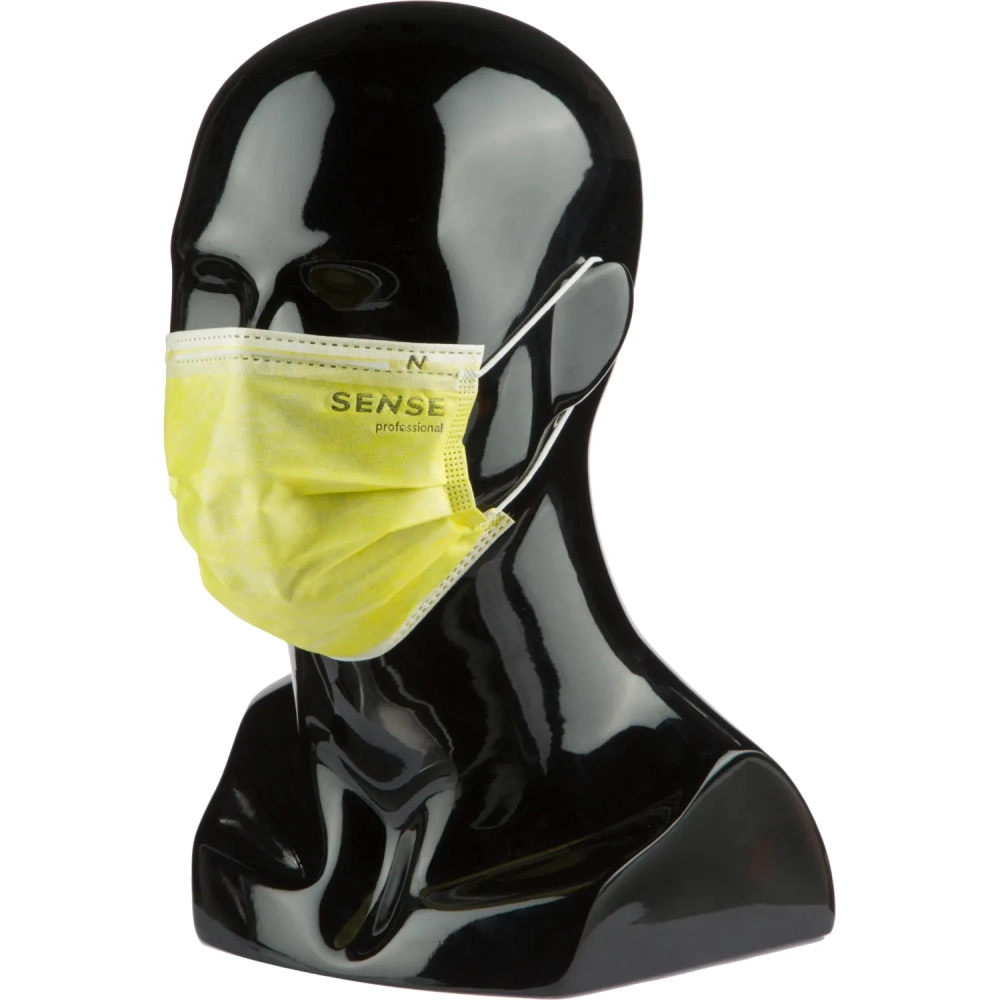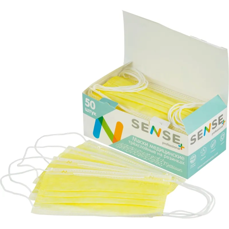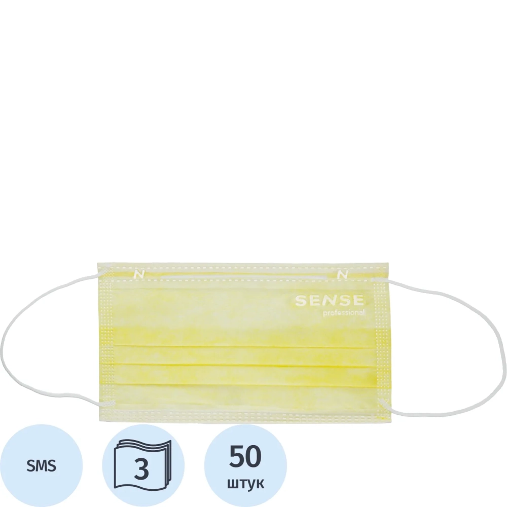 Маска медицинская 3-х сл., резинка, желтый, Sense, картон 50шт/уп