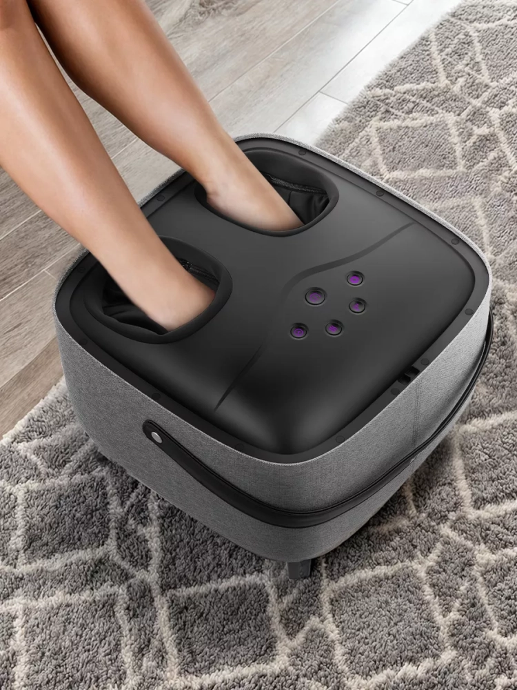 Электрический массажер для ног Kitfort KT-2968 — это превосходное устройство, обеспечивающее вашим стопам качественный уход и комфорт. Этот электромассажер предлагает два вида массажа: роликовый разминающий и воздушно-компрессионный, что позволяет выбрать наиболее подходящий вариант для ваших нужд. Массажор работает в трех режимах: первый сочетает оба типа массажа, второй фокусируется на воздушно-компрессионном массаже, а третий — на роликовом разминающем. Интенсивность лимфодренажного массажа регулируется по вашему желанию: от минимальной до максимальной. Вы можете установить длительность сеанса на 5, 10 или 15 минут. По окончании выбранного времени устройство автоматически отключается, что делает использование безопасным и удобным. Массаж стоп с помощью этого устройства способствует улучшению обменных процессов и регенерации тканей, снимает мышечное напряжение и гипертонус мышц ног, активизирует кровообращение и помогает бороться с отечностью ног. Лимфодренаж способствует общему оздоровлению организма. Дизайн массажера выполнен в форме пуфика с крышкой, выдерживающей нагрузку до 100 кг. Это позволяет использовать его не только как массажное устройство для прессотерапии ступней и ноги но также как элемент интерьера вашего дома благодаря стильному дизайну в спокойной расцветке. Ручка на крышке обеспечивает удобство переноски устройства. Съемные чехлы упрощают процесс чистки после использования массажора. Прорезиненные ножки предотвращают скольжение по полу во время работы устройства.