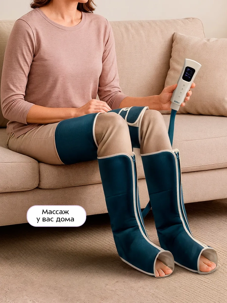 Воздушно-компрессионный массаж проводится в области стоп, голеней и бедер. Массажер работает в 6 разных режимах. Интенсивность массажа настраивается: минимальная, средняя или максимальная сила сжатия. Управление массажером осуществляется с помощью пульта. Через 20 минут работы массажера сработает автоотключение.