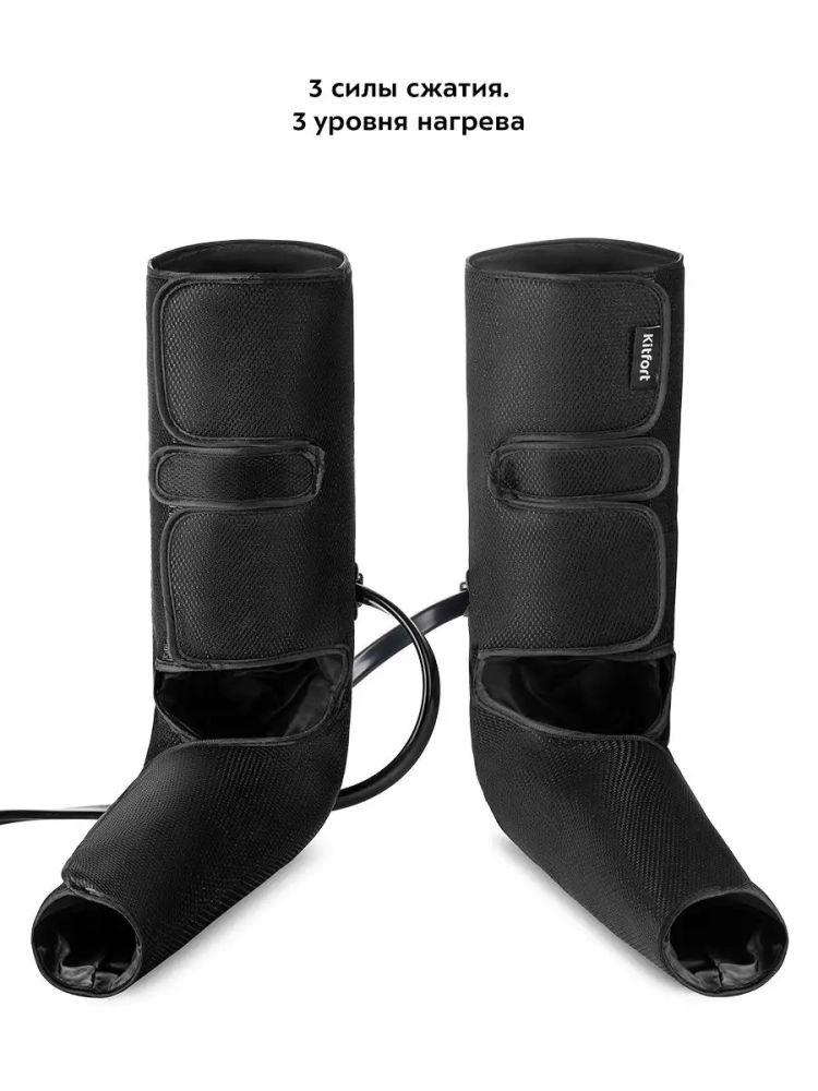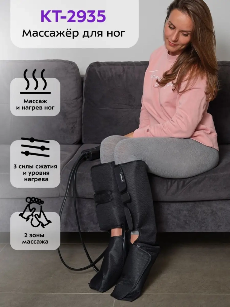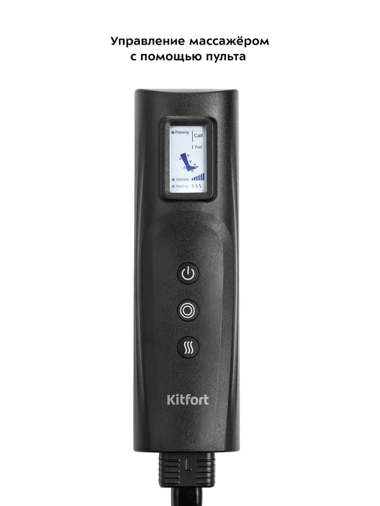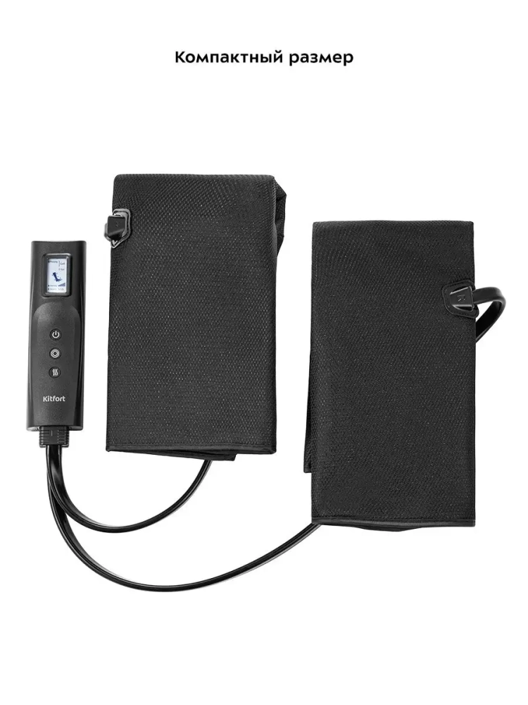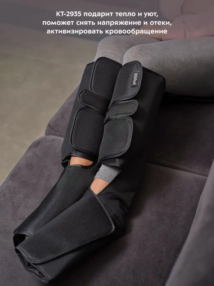 Kitfort KT-2935 — массажер для прессотерапии и лимфодренажа ног, с помошью которого можно сделать массаж икроножных мышц и стоп, не прибегая к посторонней помощи. Прибор сочетает в себе функцию воздушно-компрессионного массажа с нагревом в области стоп. Обе функции можно использовать одновременно или отдельно друг от друга. Прессотерапия осуществляет активный лимфодренаж, благотворно воздействует на обменные процессы, способствует выведению вредных веществ из организма. Лимфа играет важную роль в процессах очищения организма от токсинов и шлаков, чужеродных тел и отвечает за защитные барьеры. Процедура положительно влияет на кровеносные и лимфатические сосуды, состояние мышц, дермы и подкожный жировой слой. Массажер сделан в виде двух воздушных манжет, которые надеваются на стопы и голени и удобно крепятся с помощью липучек. Управление массажером осуществляется с помощью пульта. Вам нужно подключить устройство к сети, на пульте управления выбрать силу сжатия, зону массажа, а также включить нагрев стоп при желании. Всего три уровня сжатия, две зоны массажа и три уровня нагрева стоп. Массажер сжимает ноги, создавая эффект компрессии в той зоне, которую вы выбрали. После 20-минутного сеанса сработает таймер с автоотключением. Массажер Китфорт КТ-2935 подарит тепло и уют, поможет снять напряжение и отеки, активизировать кровообращение, улучшить течение обменных процессов, облегчить симптомы при суставных болях, а проработка активных точек на стопах благотворно влияет на весь организм. Данное устройство не является медицинским прибором и используется только в профилактических целях. Если у вас есть какие-либо заболевания, то перед использованием необходимо проконсультироваться с лечащим врачом.