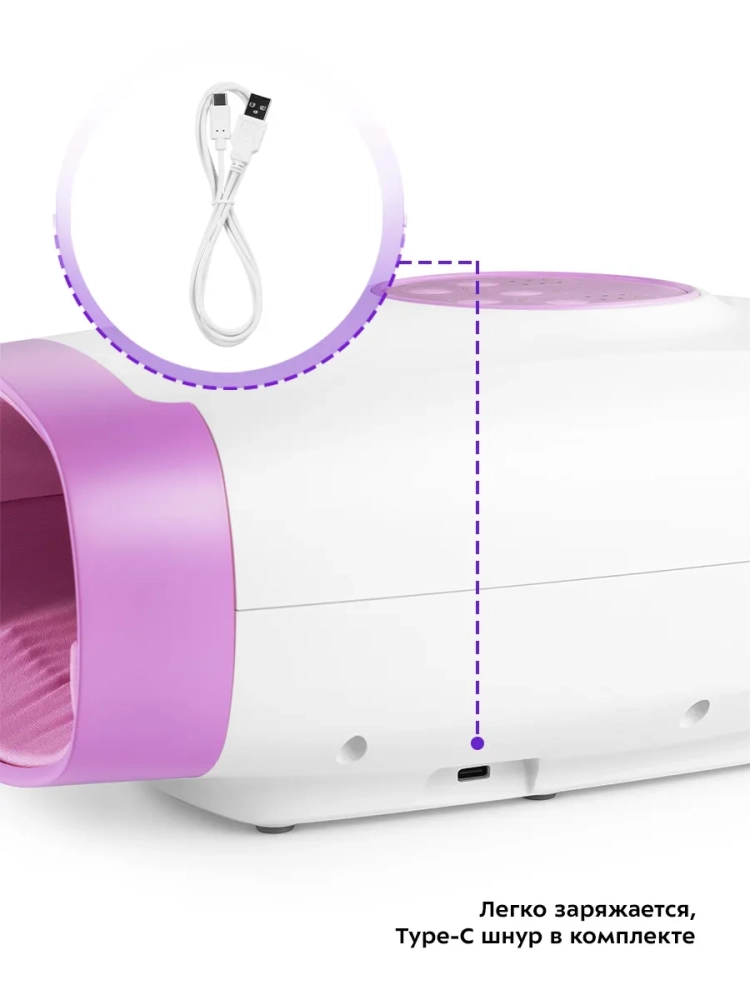 В комплект к устройству входит шнур для зарядки USB Type-C, с помощью которого вы можете зарядить массажер от розетки, используя адаптер, от компьютера или внешнего аккумулятора, который можно брать с собой в любое место. Время автономной работы составляет 4 часа при использовании массажера для рук без режимов «Вибрация» и «Подогрев». При использовании режимов «Вибрация» и «Подогрев» — 2 часа.